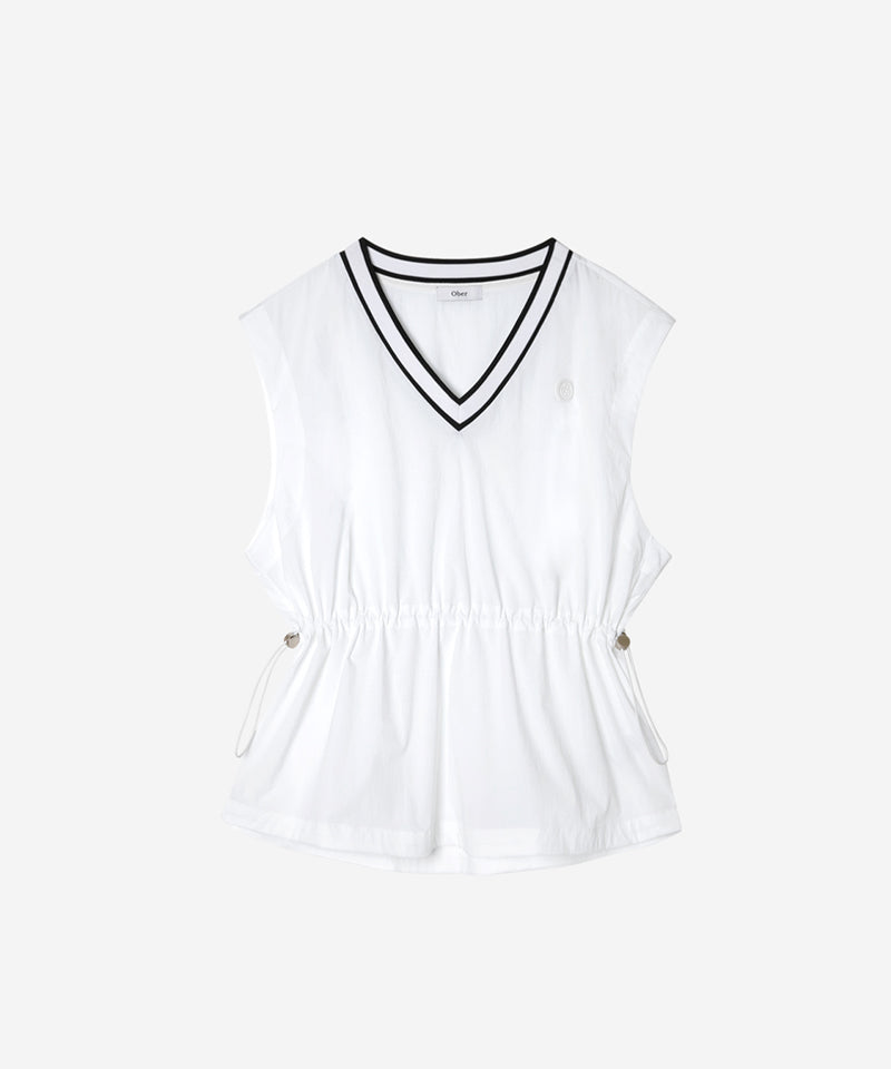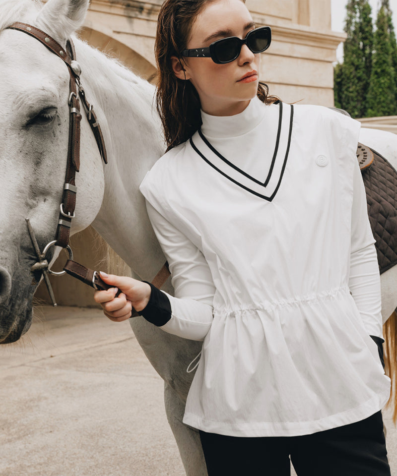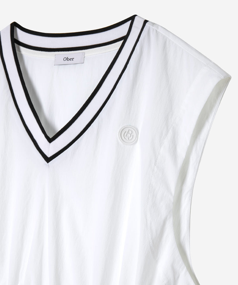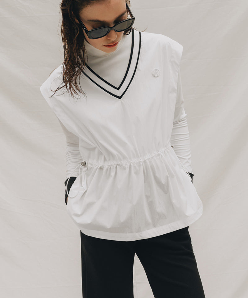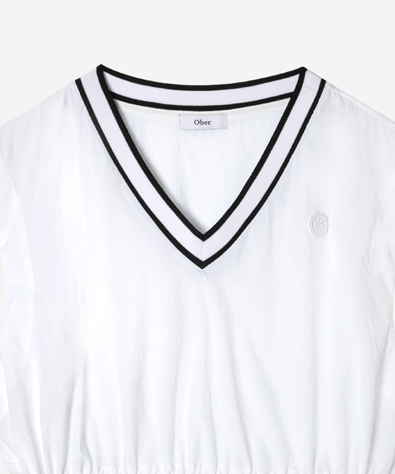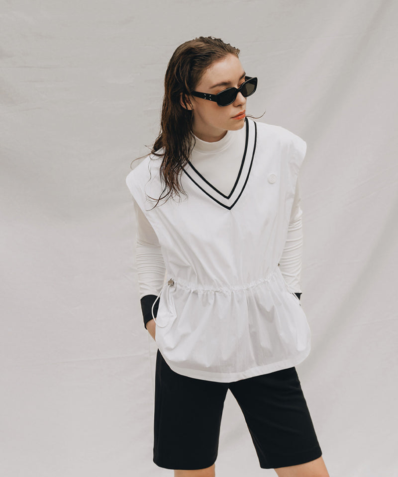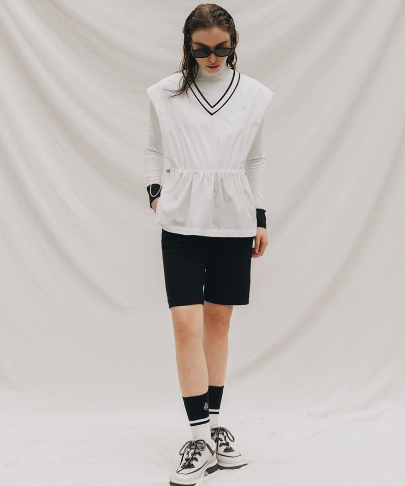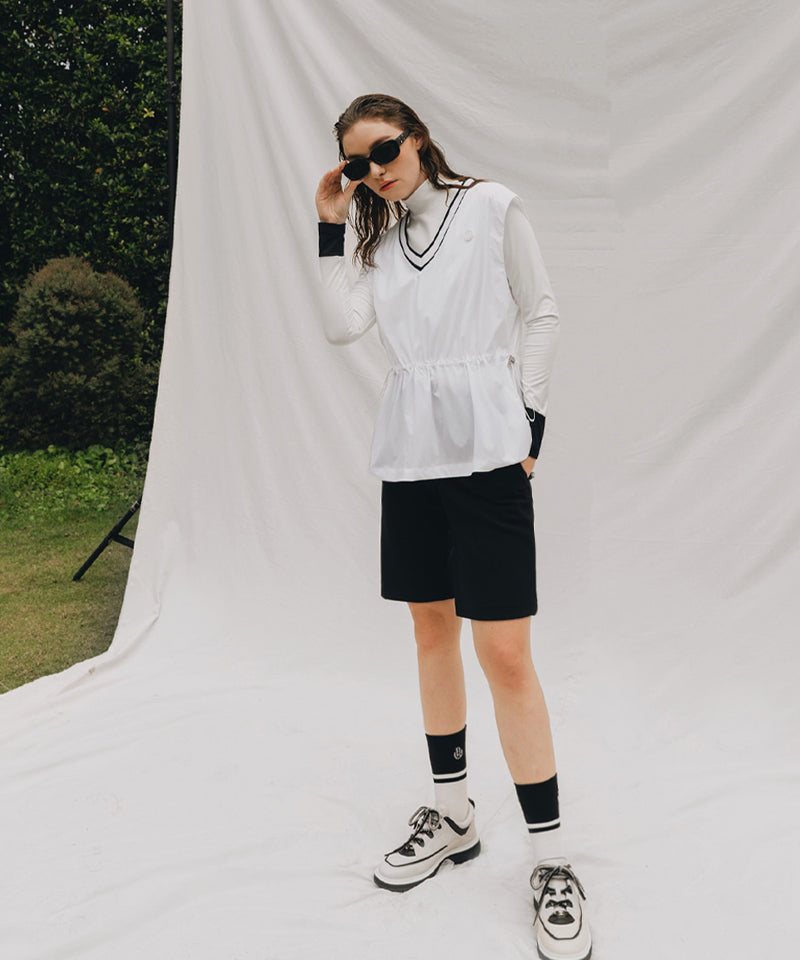 The design features a material with a luxurious glossy exterior and a sporty interior, offering a natural and unique appearance with a natural cutting finish. It is comfortable to wear, thanks to its loose fit, and expresses the brand identity with Ober Golf’s season patches. This versatile design is suitable for both everyday wear and golf wear. It pairs well with training pants or denim for a sporty look, while also complementing a minimal skirt for a more feminine style.