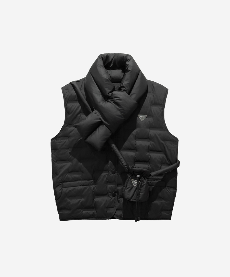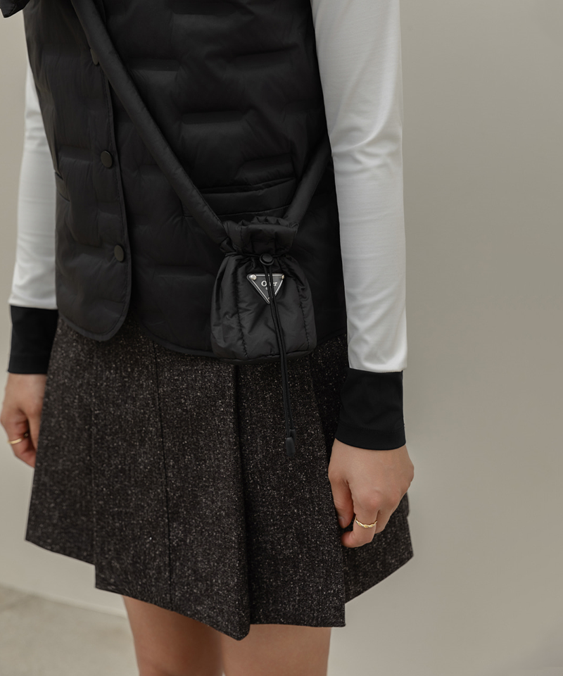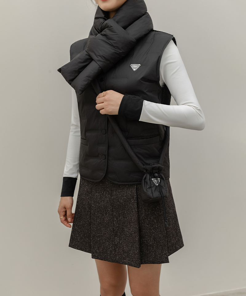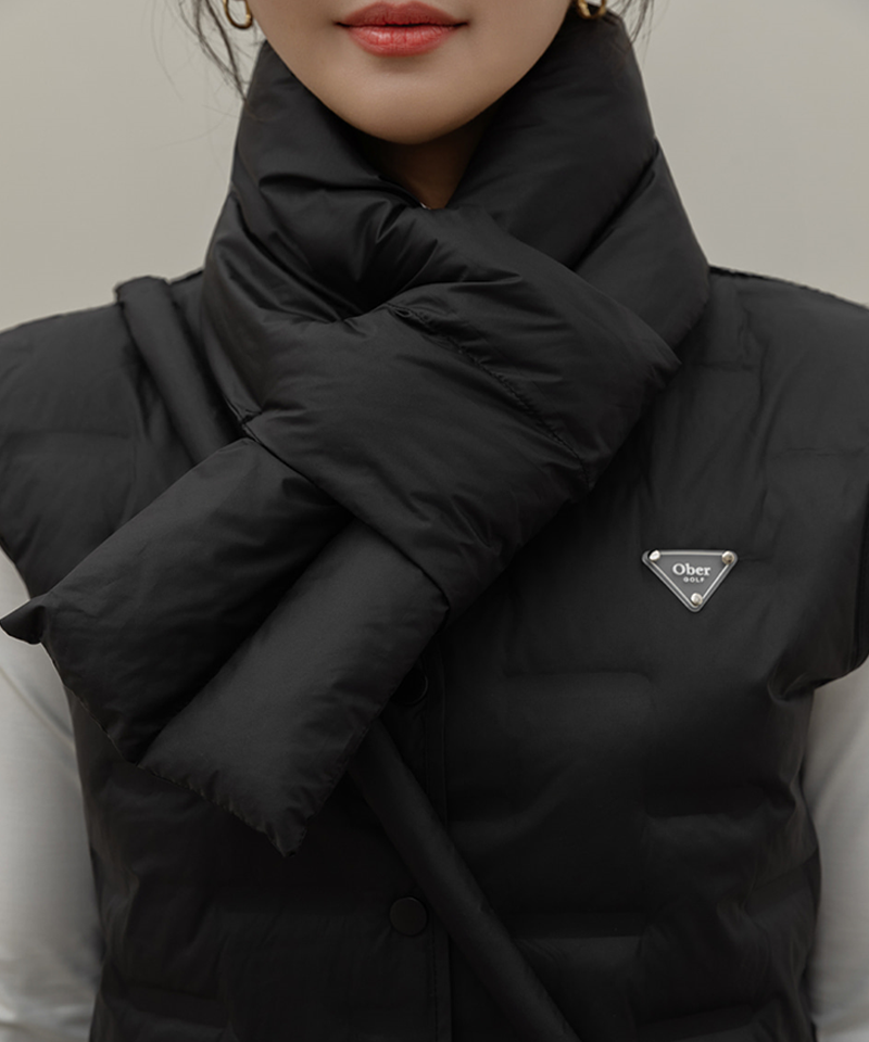 OBER Golf Lightweight Padding Set in black features a hybrid padded vest with quilted front and bouclé knit back, paired with a matching muffler and mini crossbody bag. Each piece displays dimensional quilting and signature OBER metal branding. Layer the vest under outerwear or wear standalone for a streamlined look. Mix and match the muffler and bag across your wardrobe for versatile cold-weather styling.