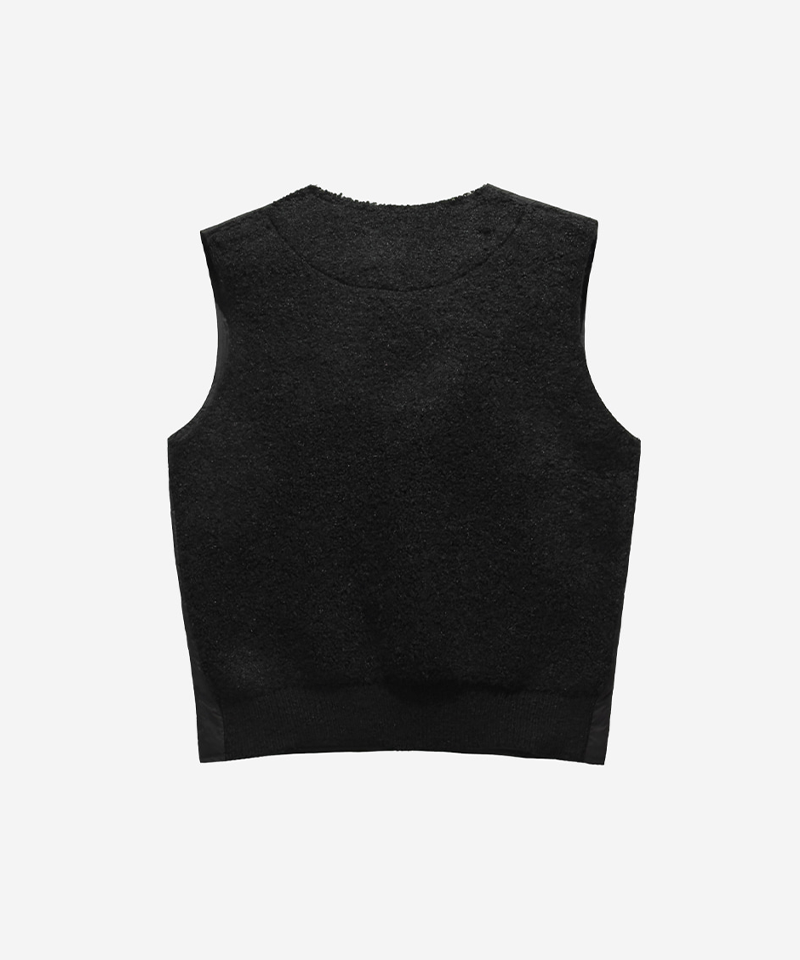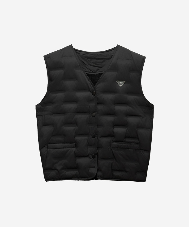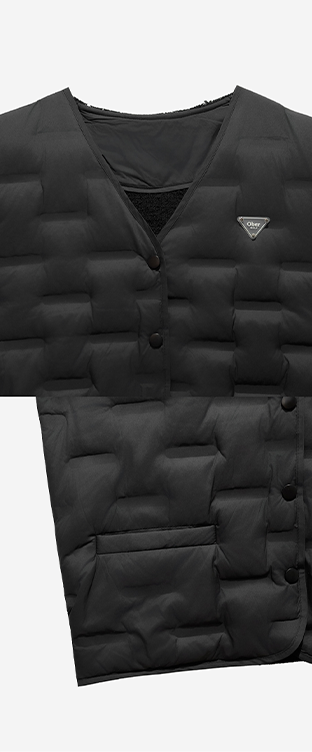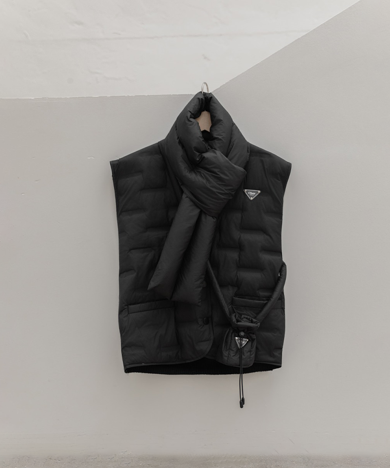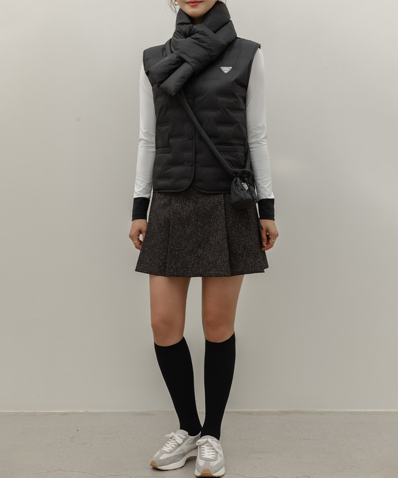 OBER Golf Lightweight Padding Set in black features a hybrid padded vest with quilted front and bouclé knit back, paired with a matching muffler and mini crossbody bag. Each piece displays dimensional quilting and signature OBER metal branding. Layer the vest under outerwear or wear standalone for a streamlined look. Mix and match the muffler and bag across your wardrobe for versatile cold-weather styling.