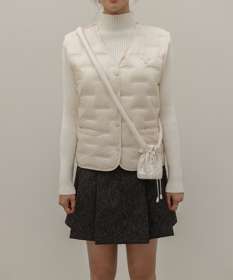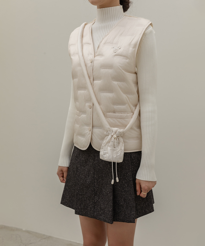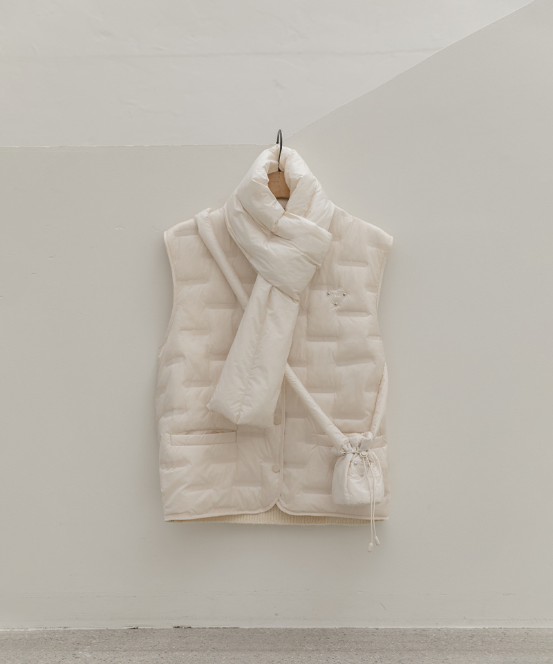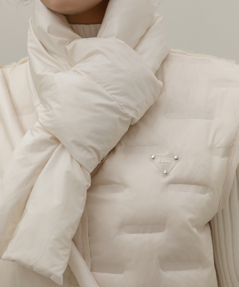 OBER Golf Lightweight Padding Set in ivory brings together a hybrid padded vest with quilted front and bouclé knit back, plus a coordinating muffler and mini crossbody bag. Dimensional quilting and the signature OBER metal logo define each piece. Wear the vest layered or solo for a refined silhouette suited to golf and daily wear. Style the muffler and bag separately to create multiple looks from one elegant set.