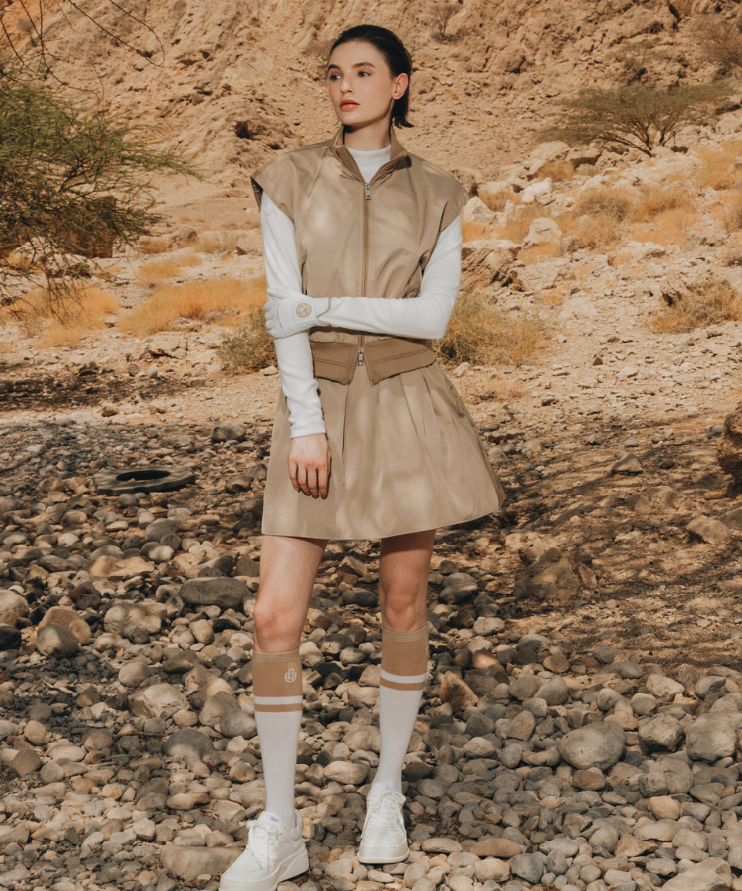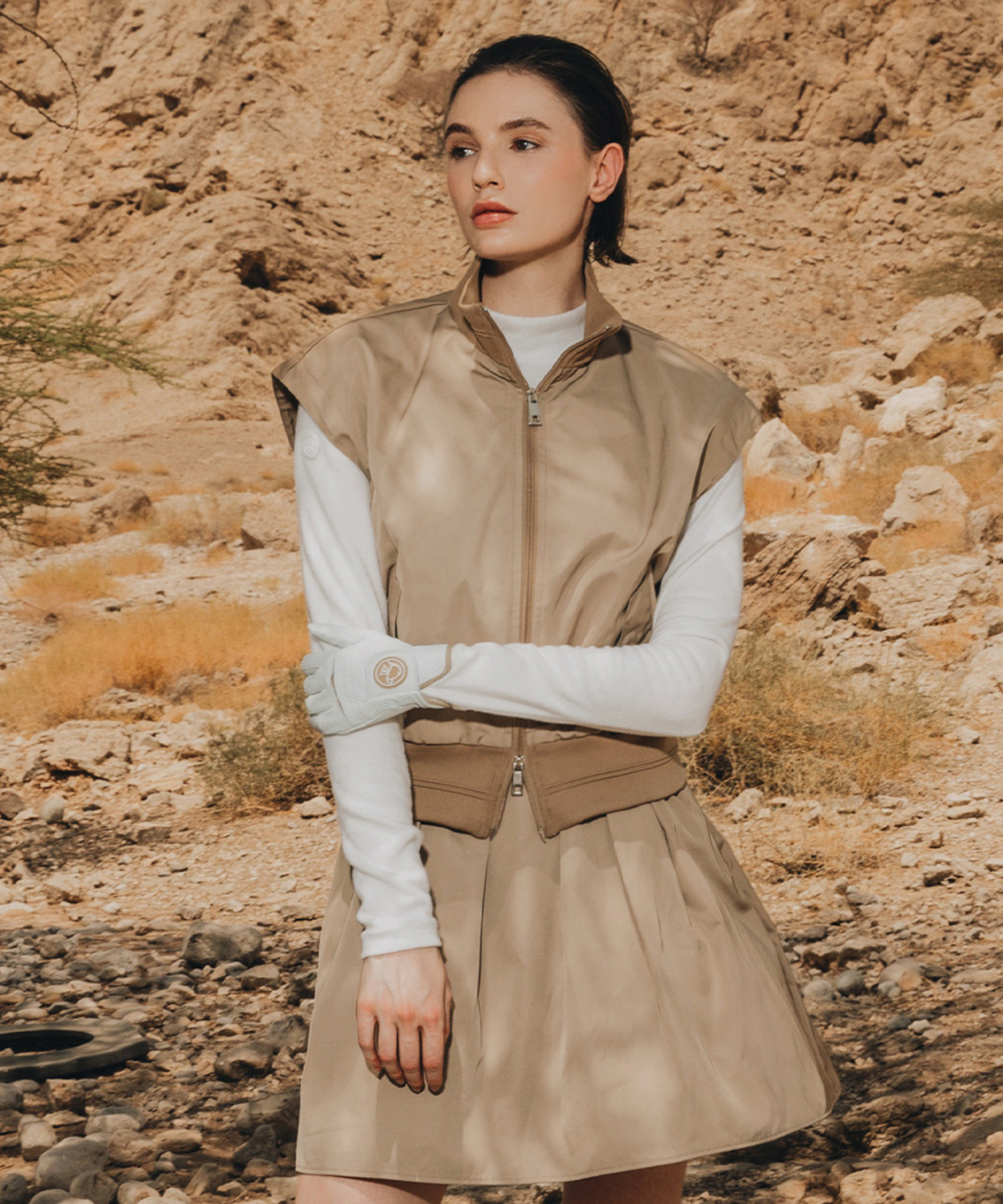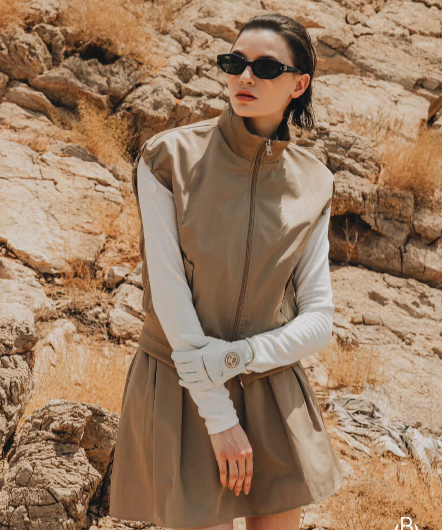 This memory fabric windbreaker vest features a delicate sheen and refined knit accents at the neckline and hem. Its adjustable shoulder strings ensure a personalized fit, while the two-way zipper allows for effortless mobility. Adorned with the distinguished Ober Golf patch, it effortlessly conveys brand elegance. The minimalist yet luxurious design pairs seamlessly with a variety of inner layers and coordinates perfectly with the 'Memory Volume Skirt' crafted from the same premium material.