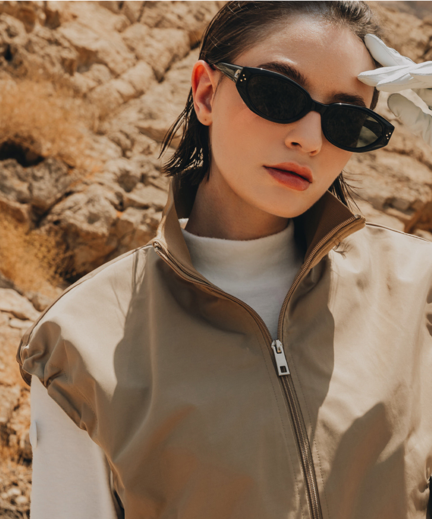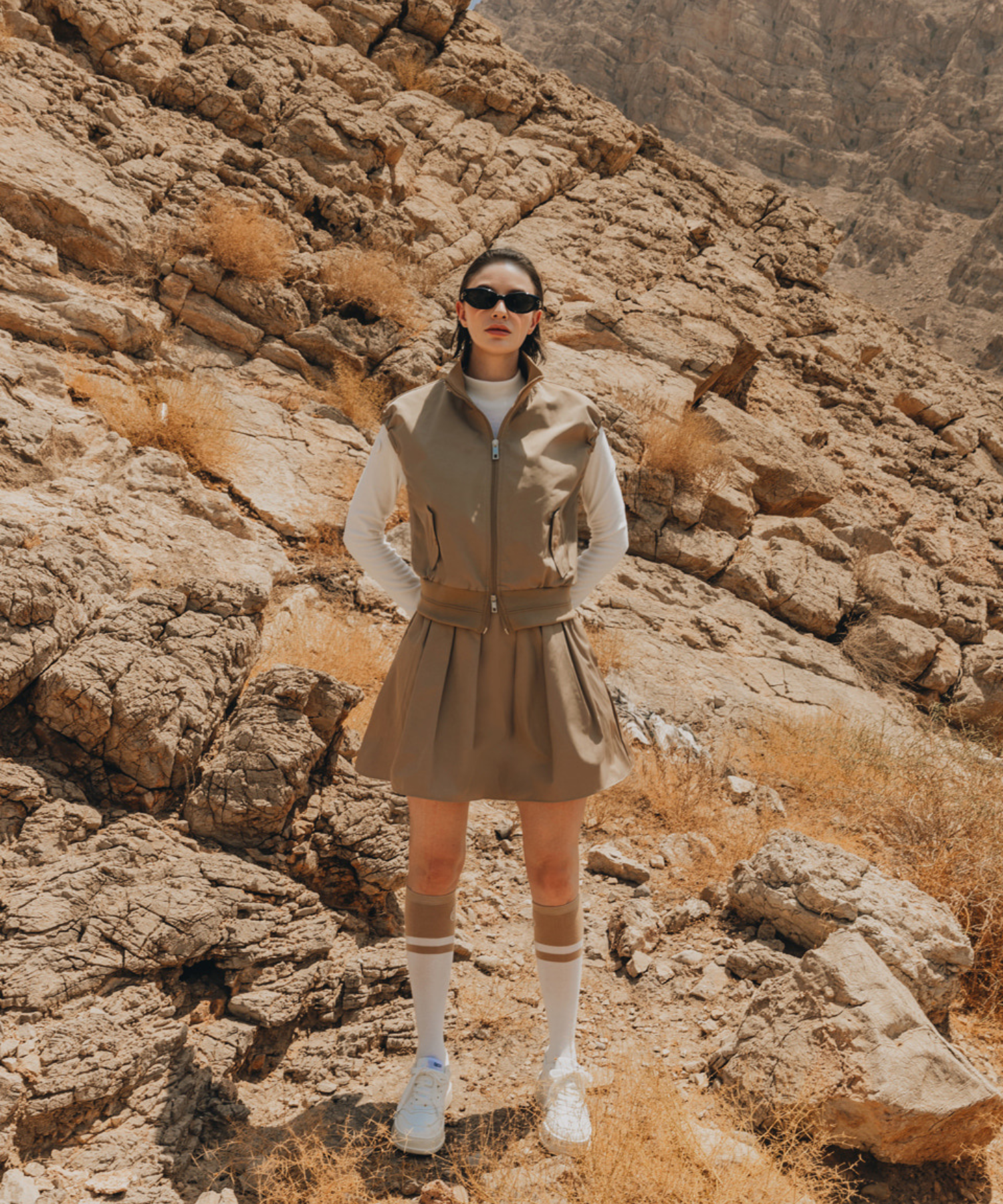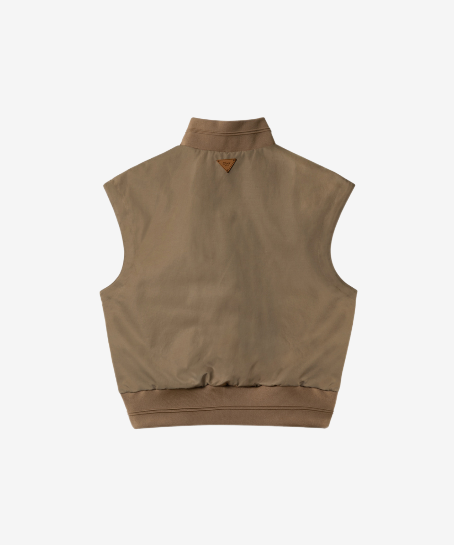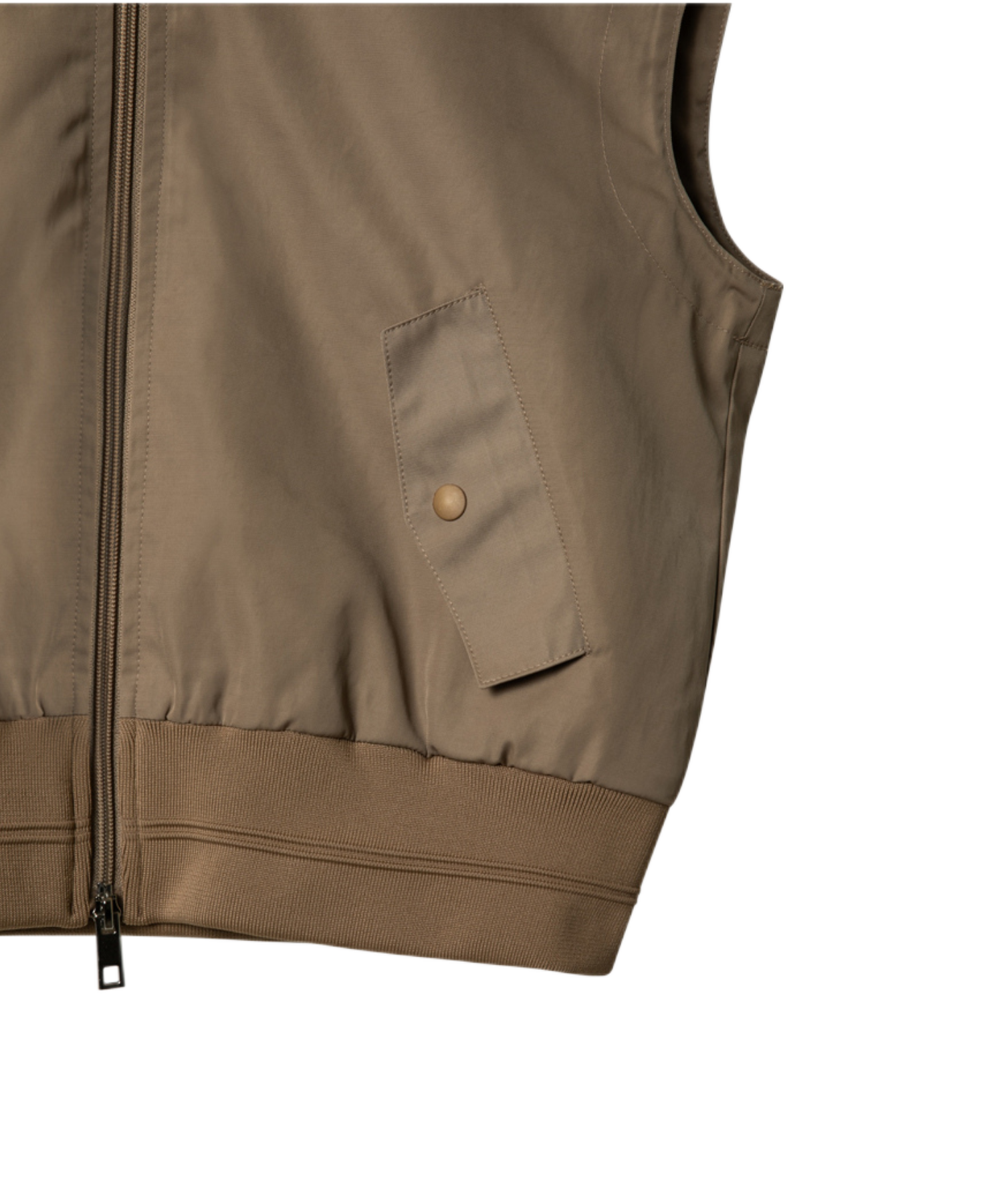 This memory fabric windbreaker vest features a delicate sheen and refined knit accents at the neckline and hem. Its adjustable shoulder strings ensure a personalized fit, while the two-way zipper allows for effortless mobility. Adorned with the distinguished Ober Golf patch, it effortlessly conveys brand elegance. The minimalist yet luxurious design pairs seamlessly with a variety of inner layers and coordinates perfectly with the 'Memory Volume Skirt' crafted from the same premium material.
