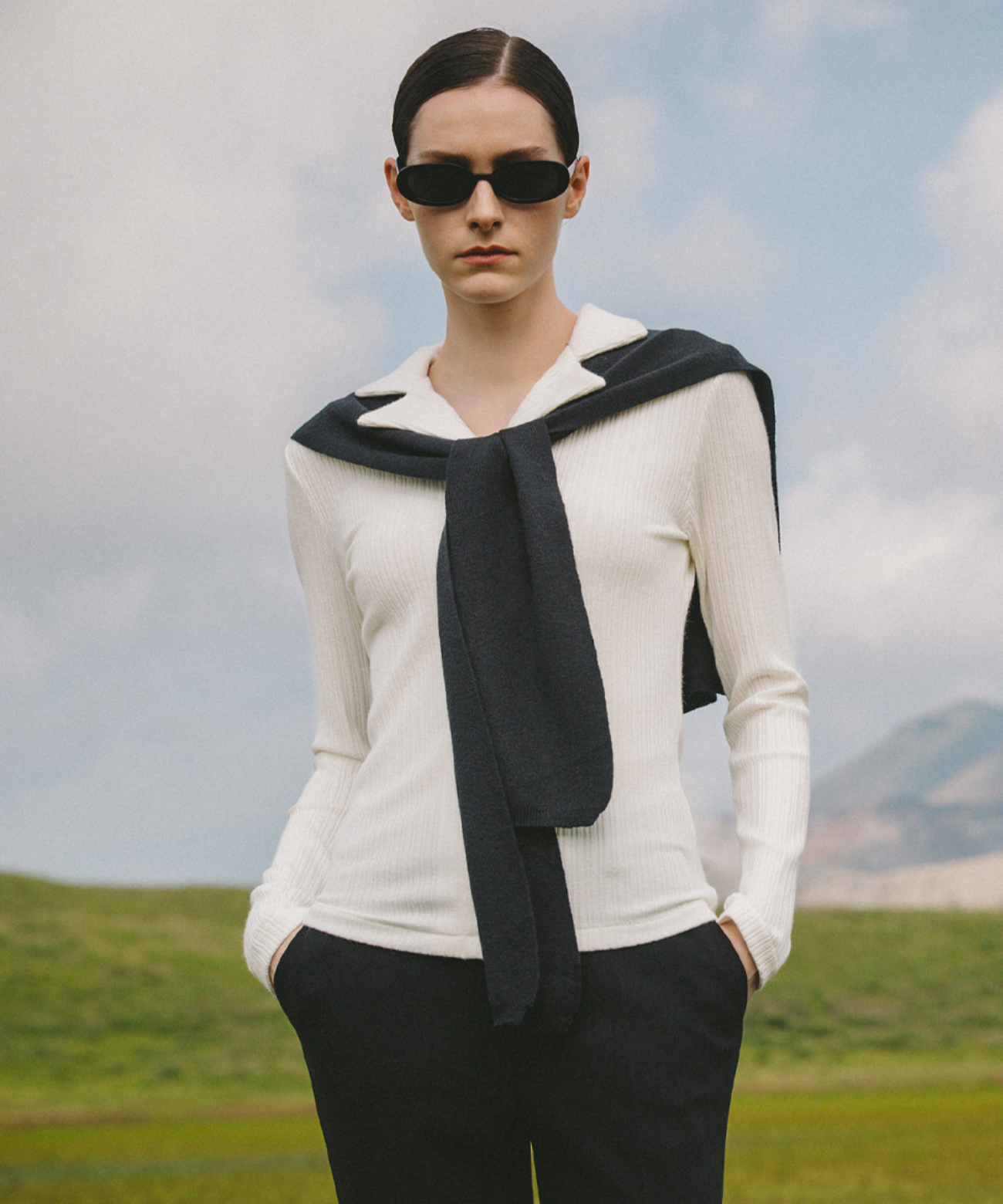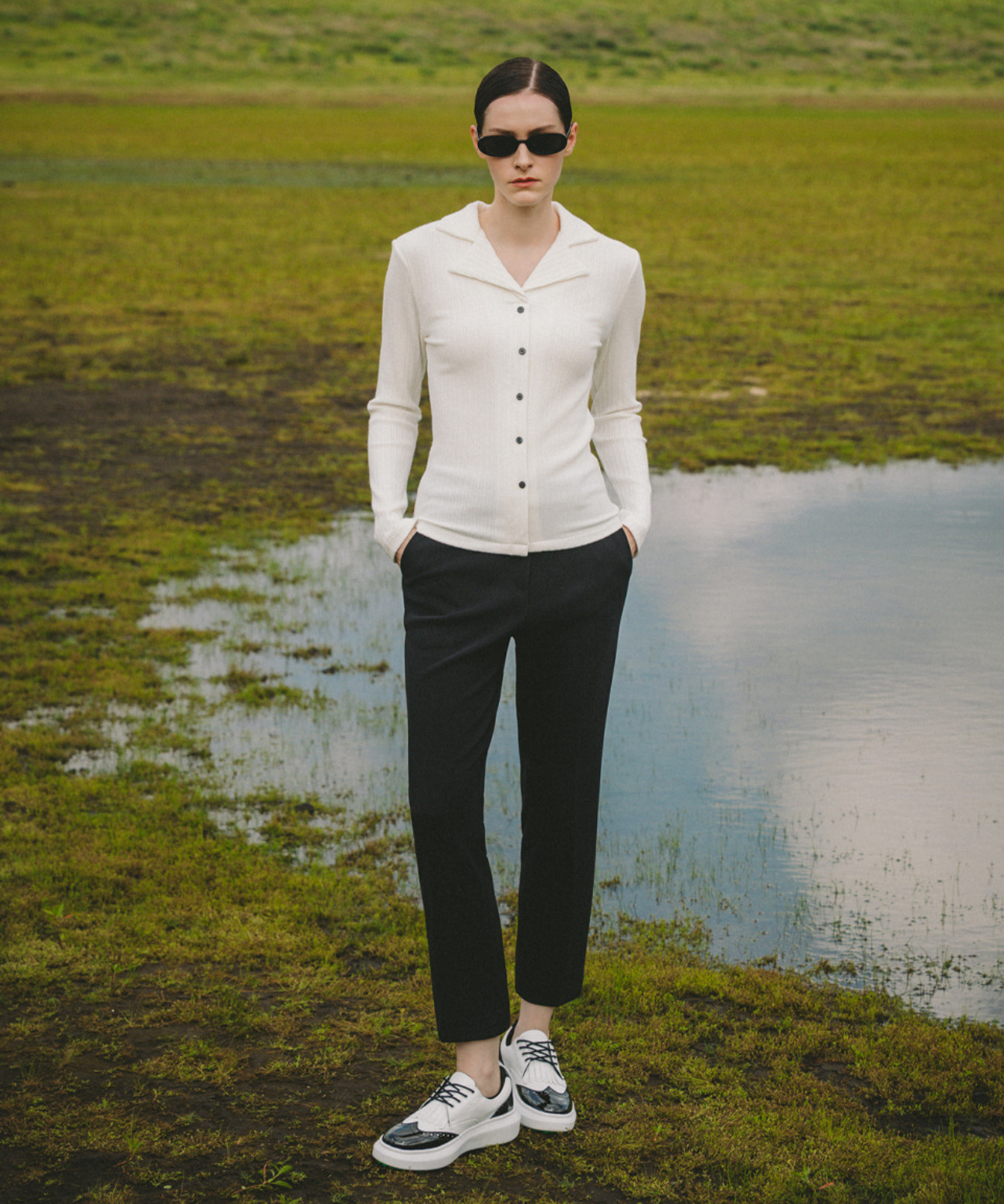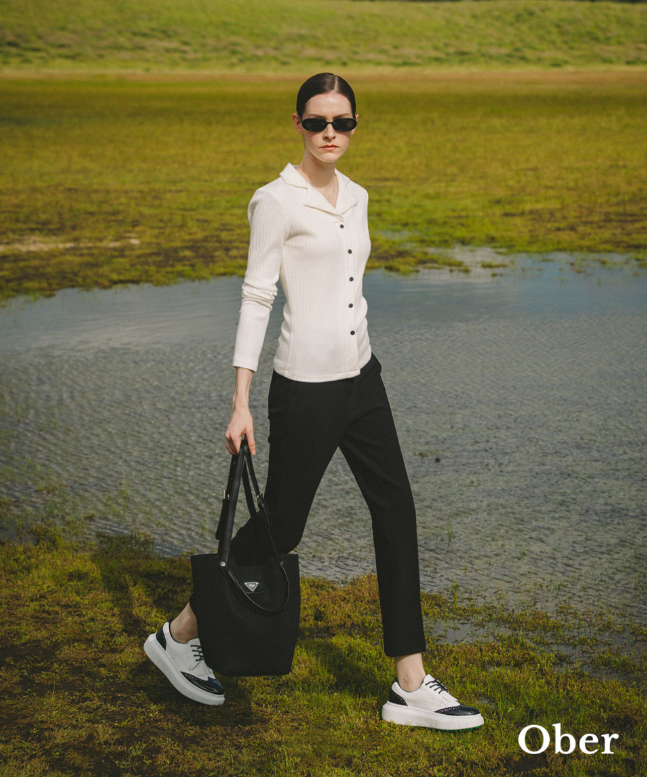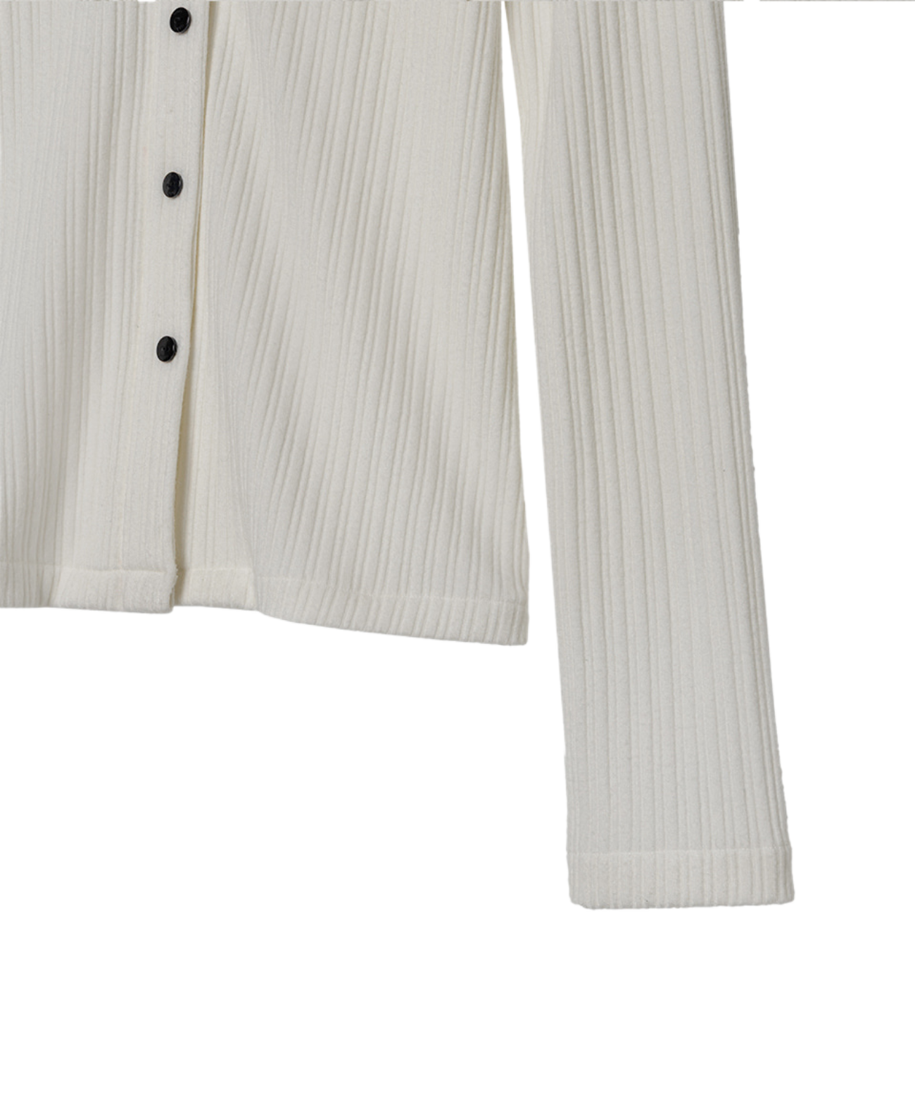 This ivory shirt features a sleek, long silhouette with vertical ribbing and refined collar details. Fixed front buttons ensure a secure fit, while performance elements support stability during swings. Subtle OBER branding on the engraved buttons adds elegance. Versatile and polished, it pairs well with knit vests, cardigans, and sweatshirts for both the golf course and everyday wear.