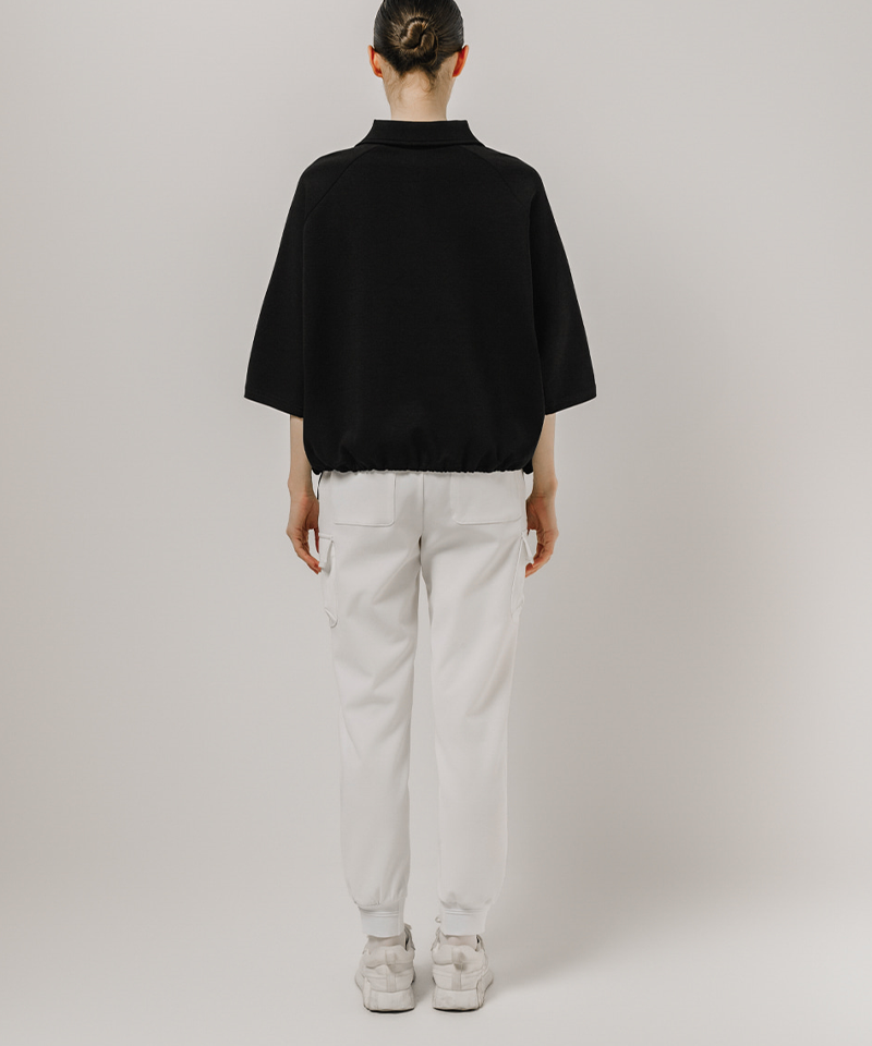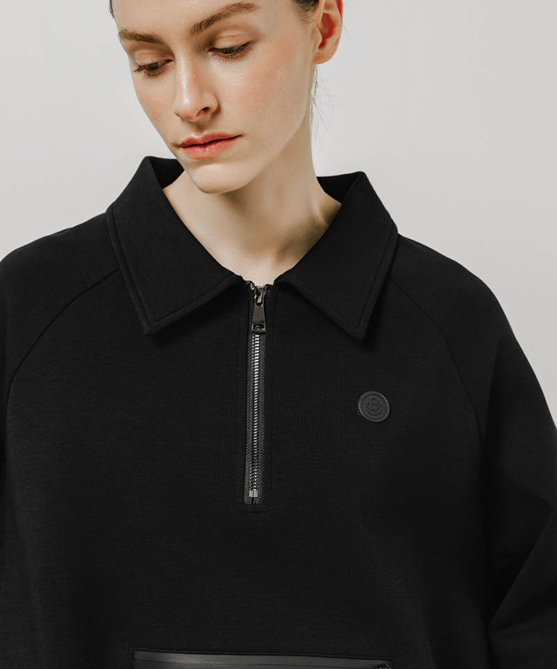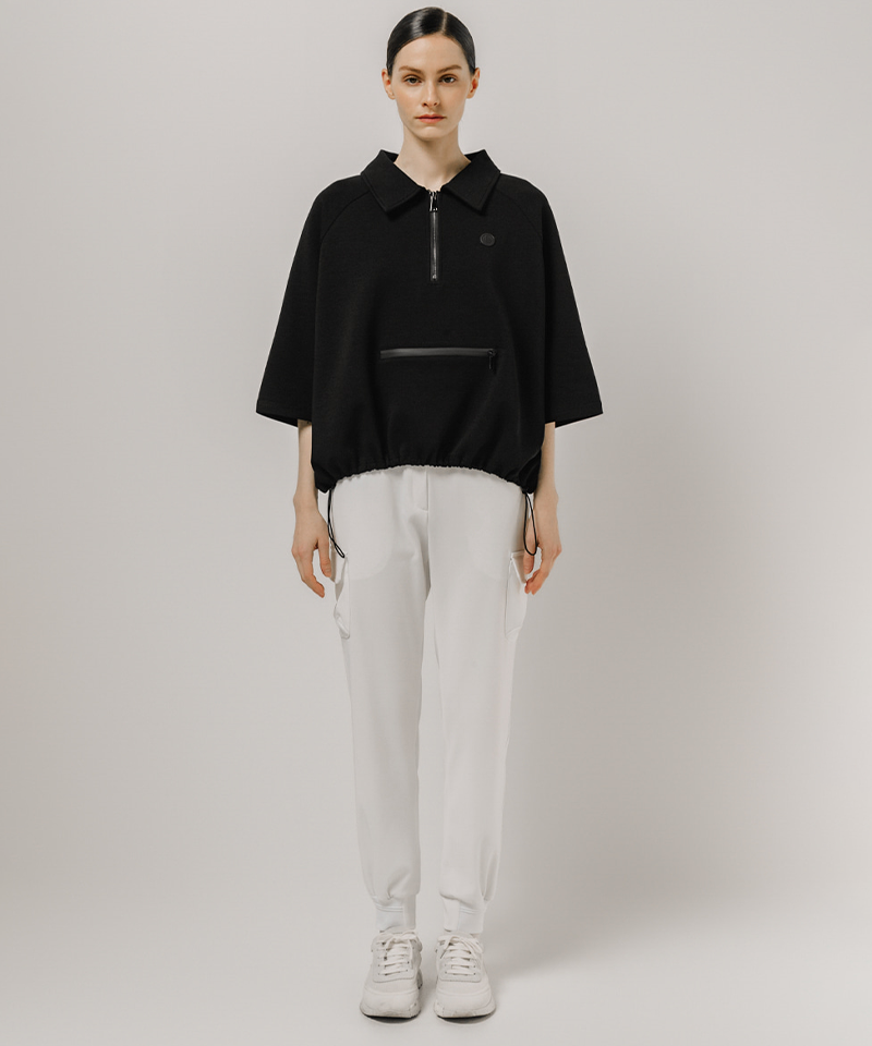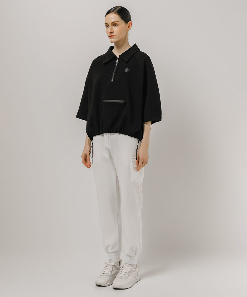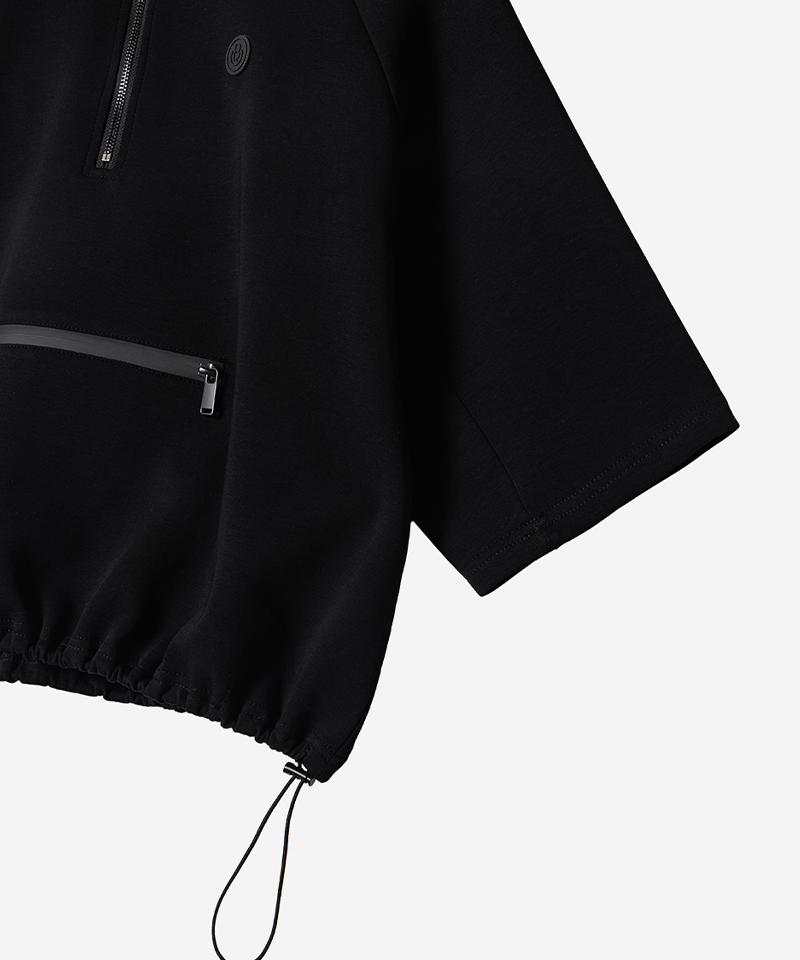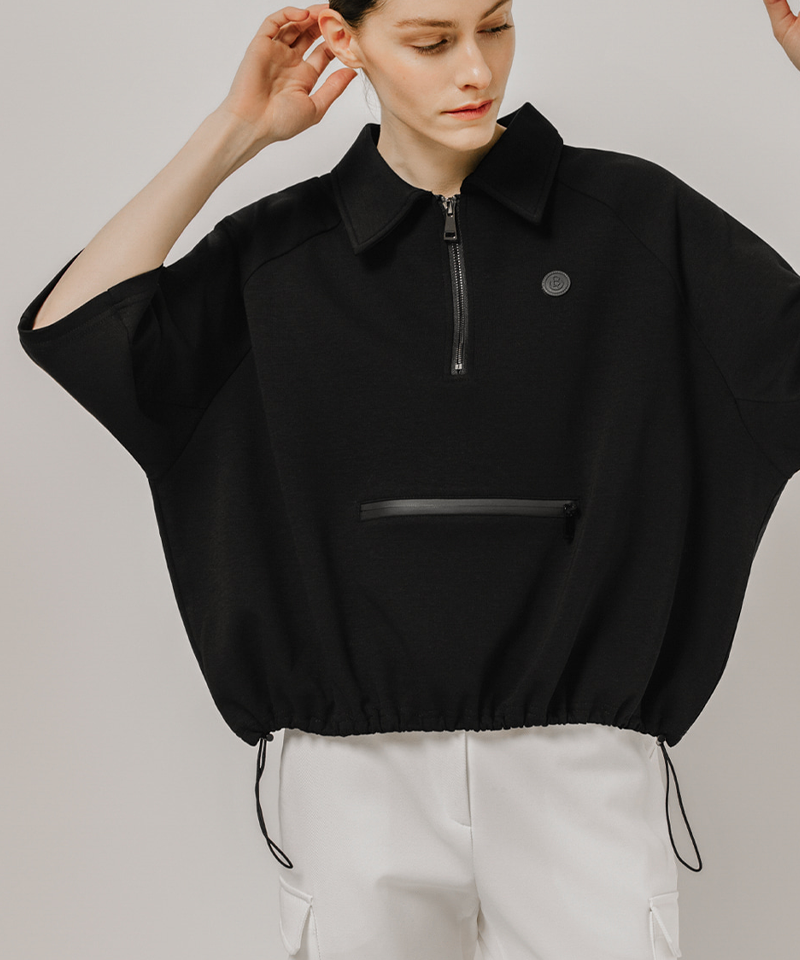 Stay stylish and comfortable with the Half-Zip Boxy Pullover. Featuring a relaxed boxy fit, a sporty faux horizontal zipper, and an adjustable hem string, it offers versatile styling and a polished silhouette. The premium half-zip neckline provides freedom of movement and ventilation, making it perfect for the course or casual wear.