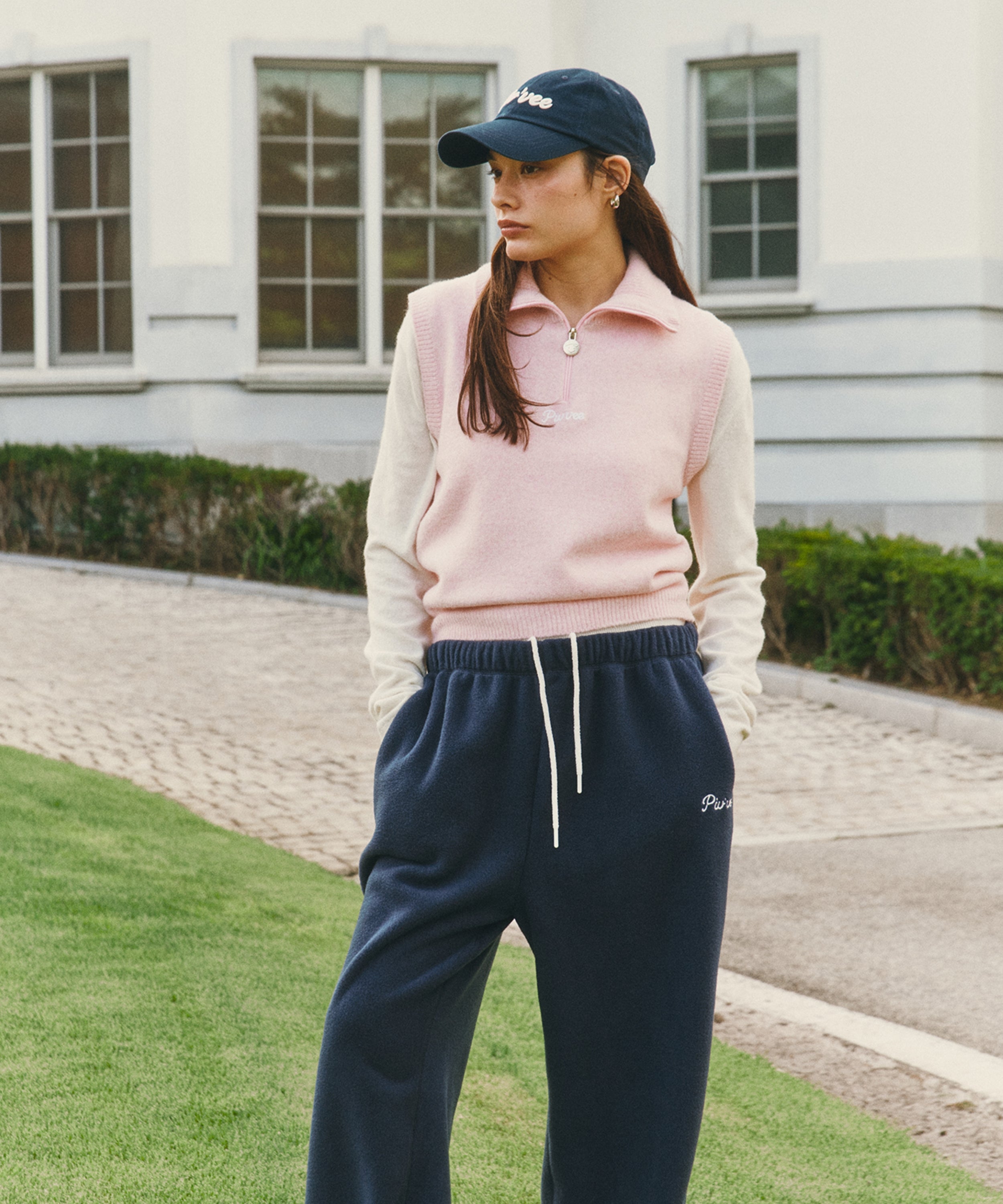 This windproof knit vest features a front zipper adorned with PvB lettering embroidery and a striking giant logo jacquard on the back. Lined for extra warmth and wind resistance, its semi-zip design offers adjustable comfort—zip up for coziness or unzip for breathability. Lightweight and flexible, it suits both athletic activities and everyday wear. Please note, the multi-thread yarn may naturally contain slight impurities, which are not defects but characteristic of the material.