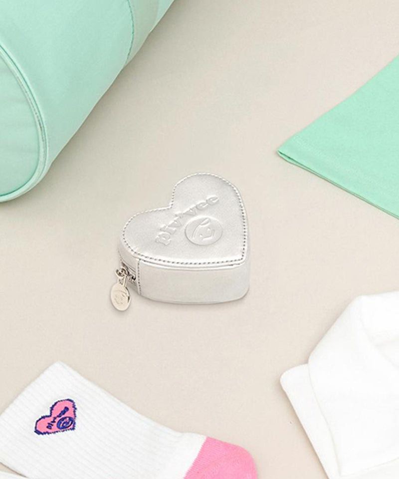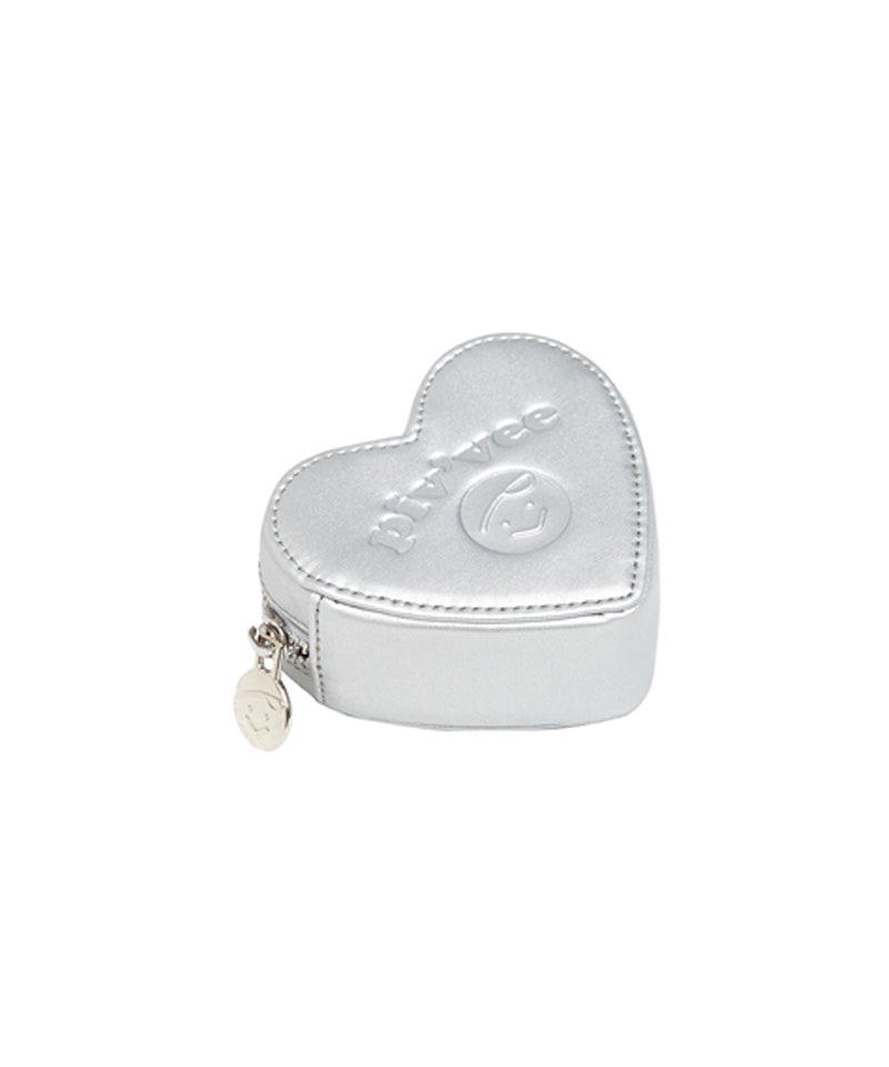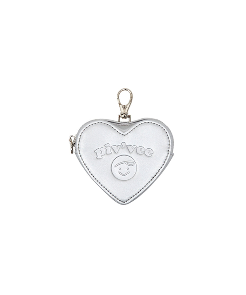 Heart-shaped pouch bag durable silver-coated PU material engraved Piv'vee logo on the front. Piv'vee logo zippers sized to hold various small items (fits 2 golf balls) top holder clip for hanging on pants or bags.