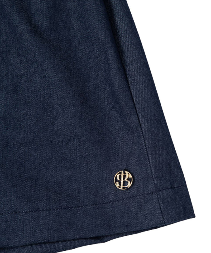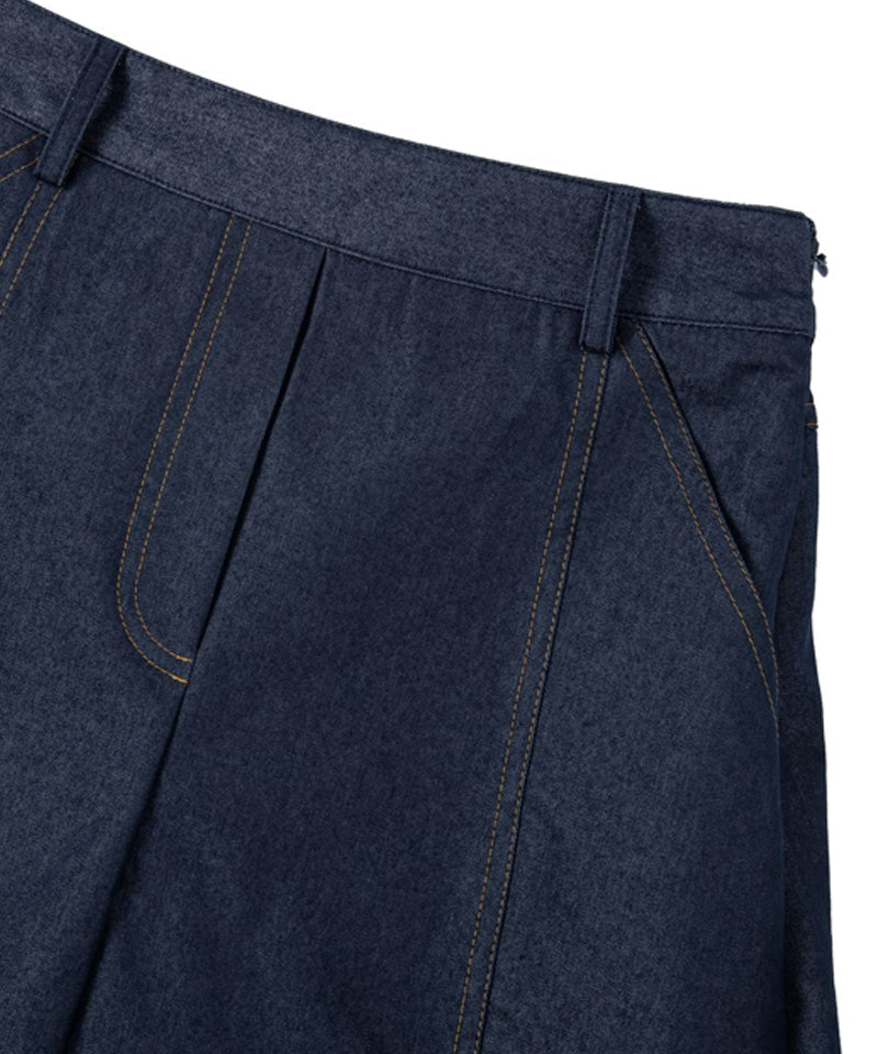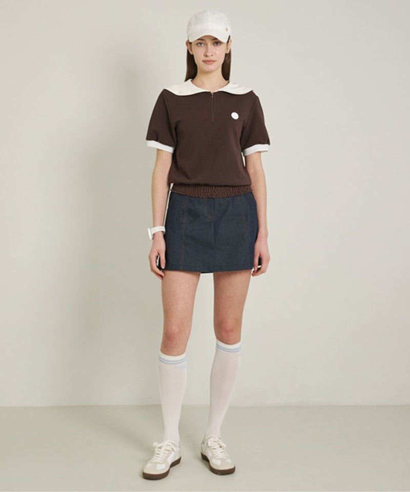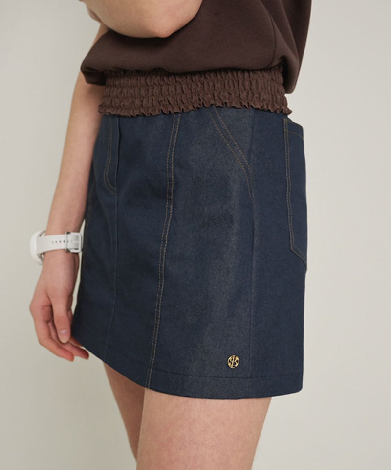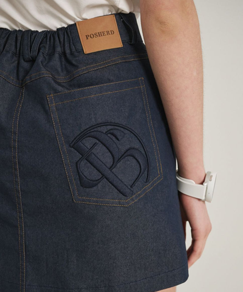 High-stretch denim golf skirt with a soft touch length balance and semi-A-line fit that makes your legs look longer. An attractive item with a subtle gloss and deep indigo color. High-quality rubber embroidery points on the back pocket high activity and comfortable fit. Back waistband and underpants attached side YKK zipper and D-ring detail. A highly versatile item that can be matched with a variety of styling.
