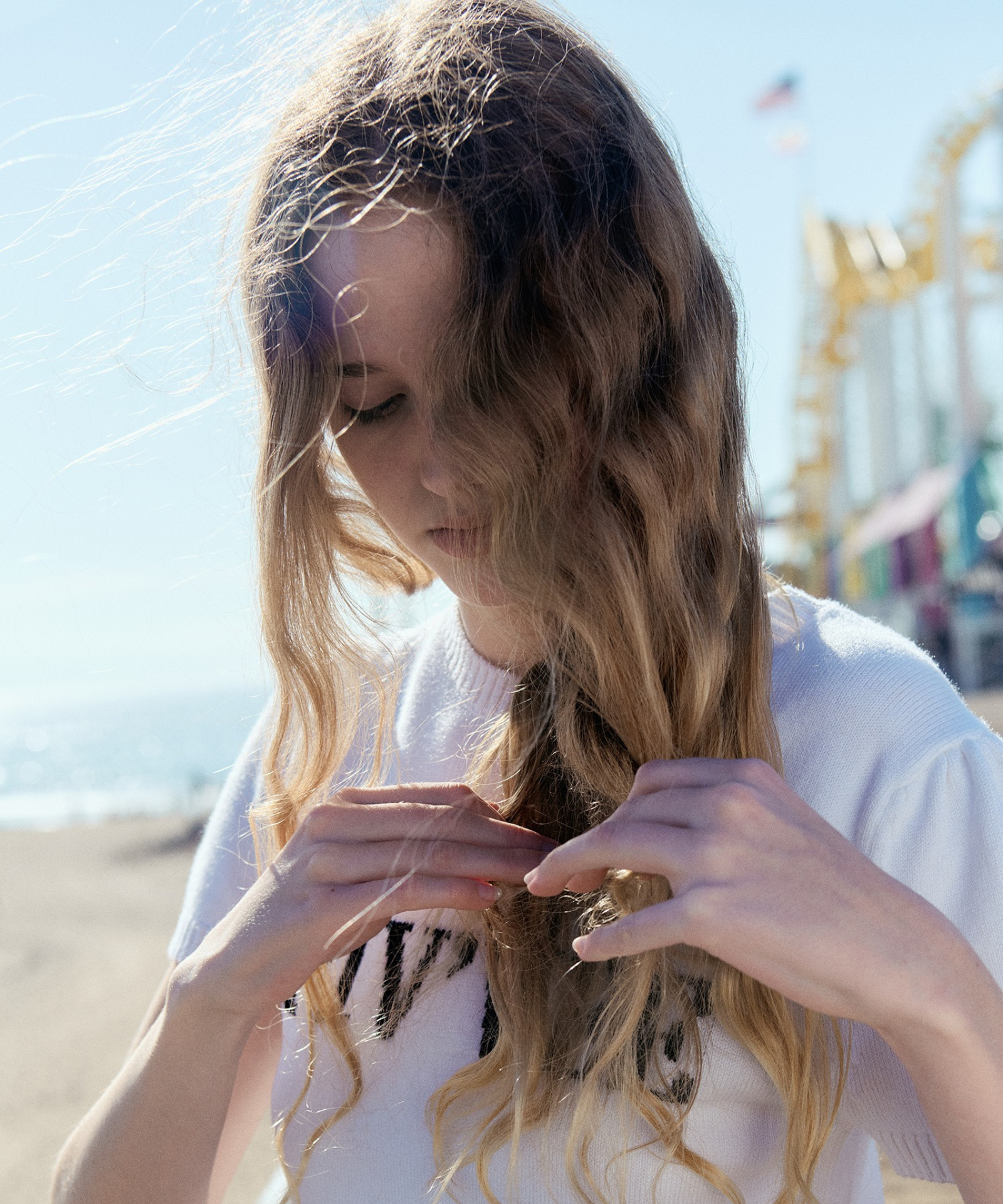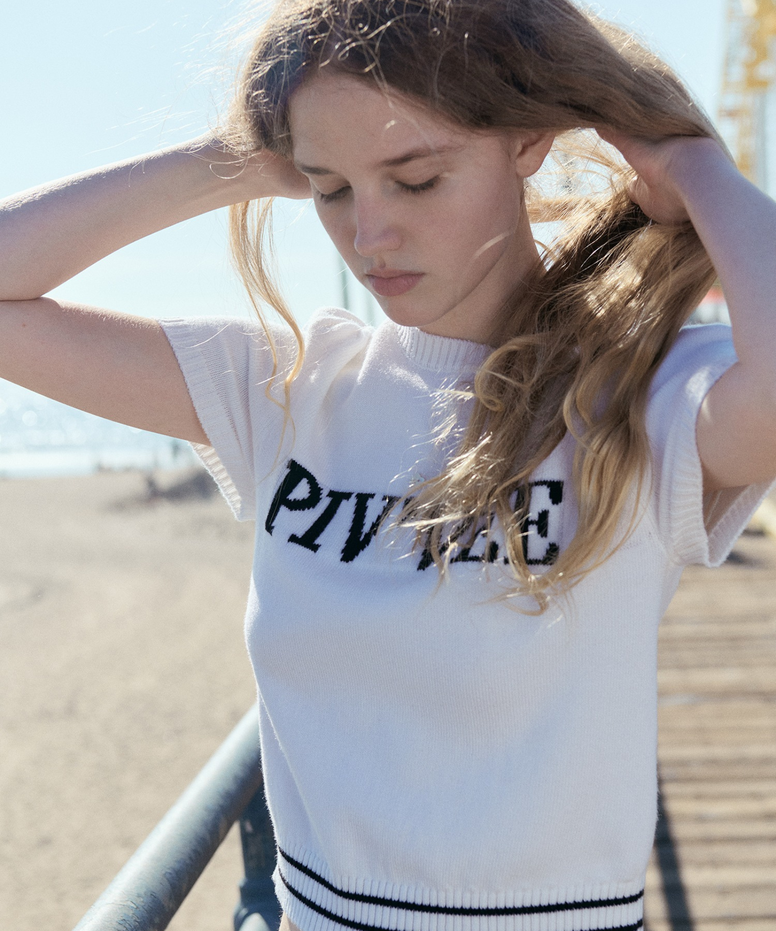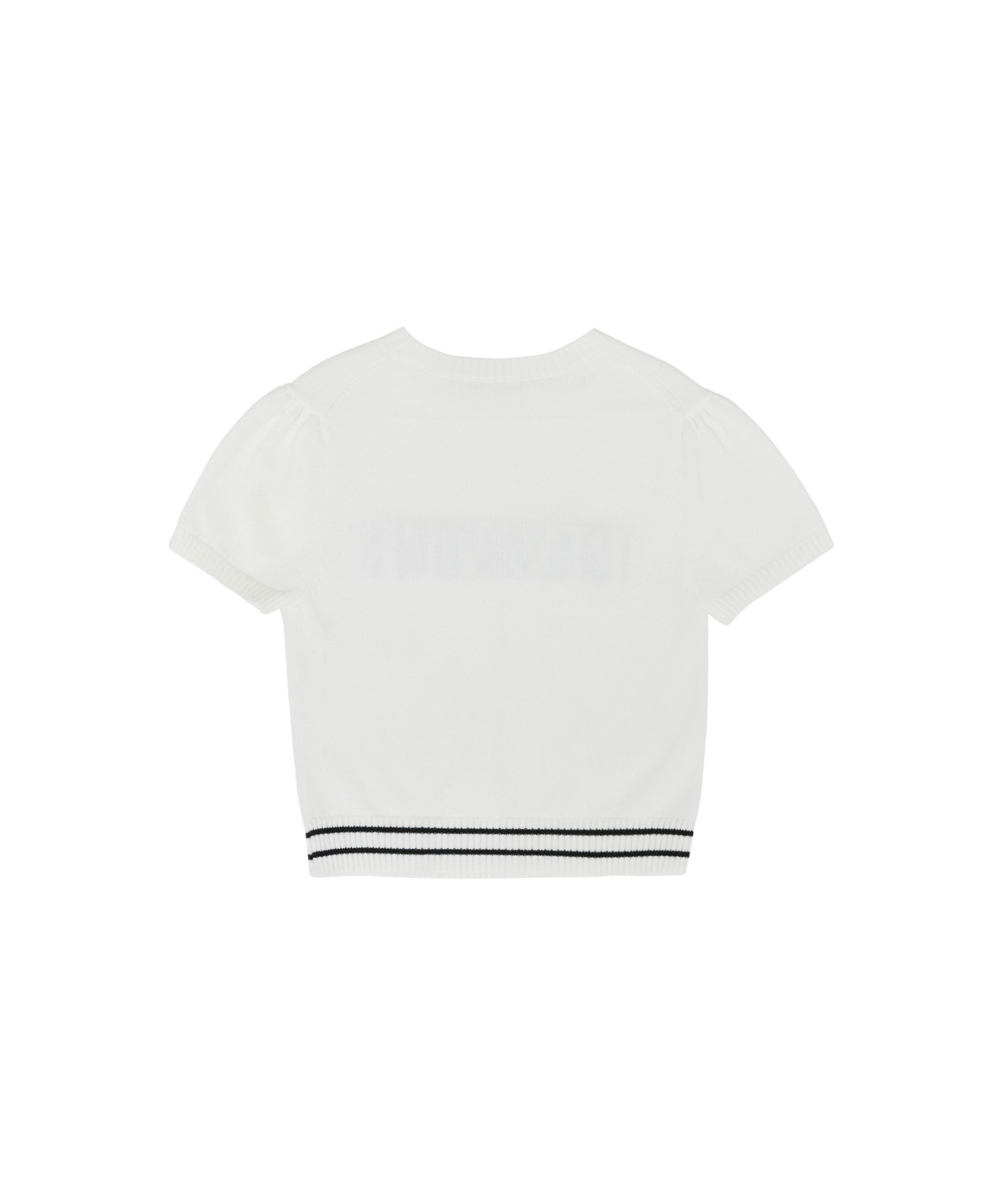 Short-Sleeved Logo Knit – This short-sleeved knit features a bold logo jacquard pattern that highlights brand identity, while the large logo design creates a strong visual presence. Mother-of-pearl star button details add a subtle touch of luxury, and puff sleeves bring soft volume to enhance a feminine silhouette. A standout seasonal piece designed to shine on its own.