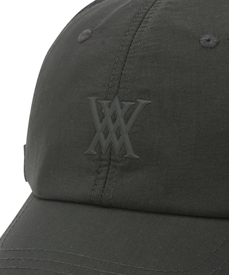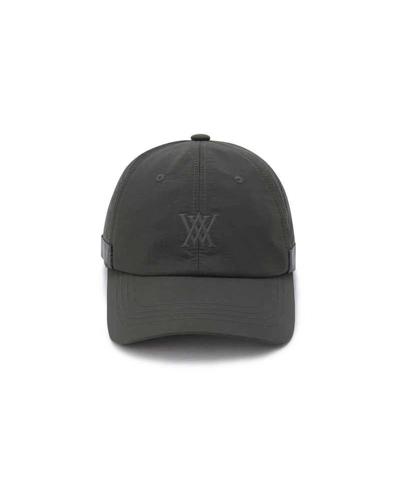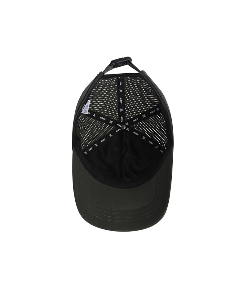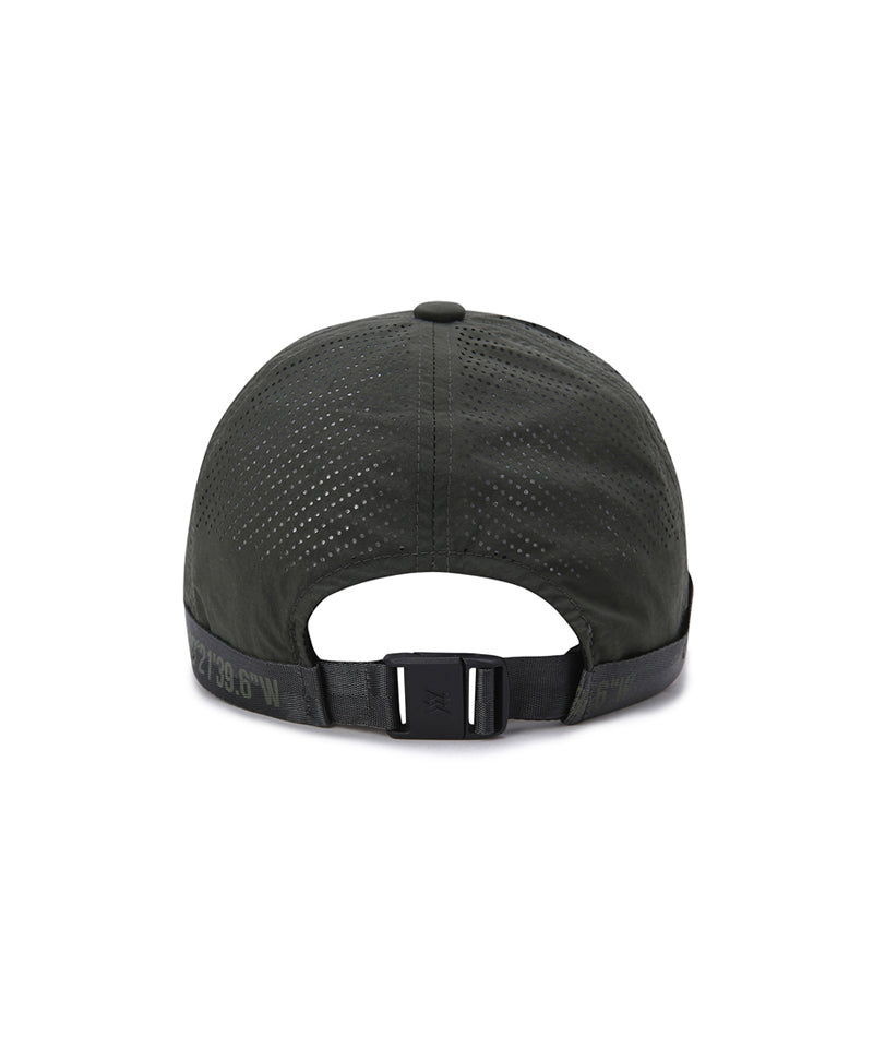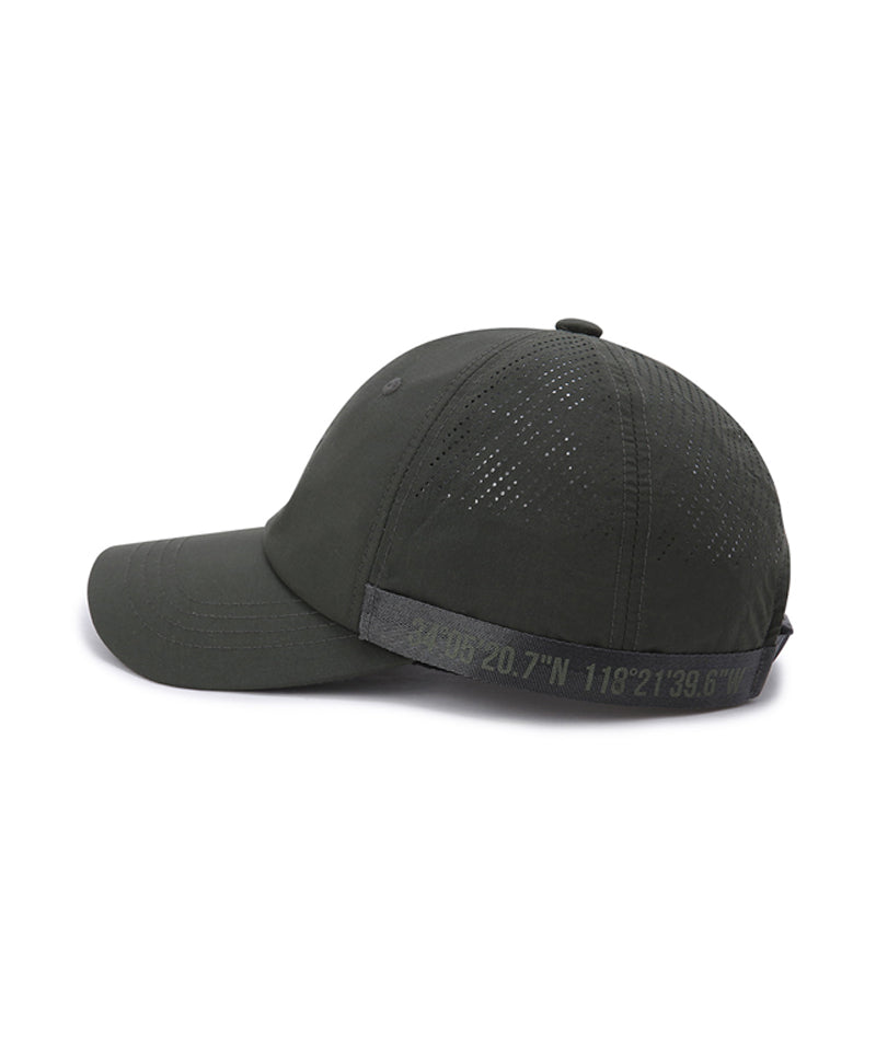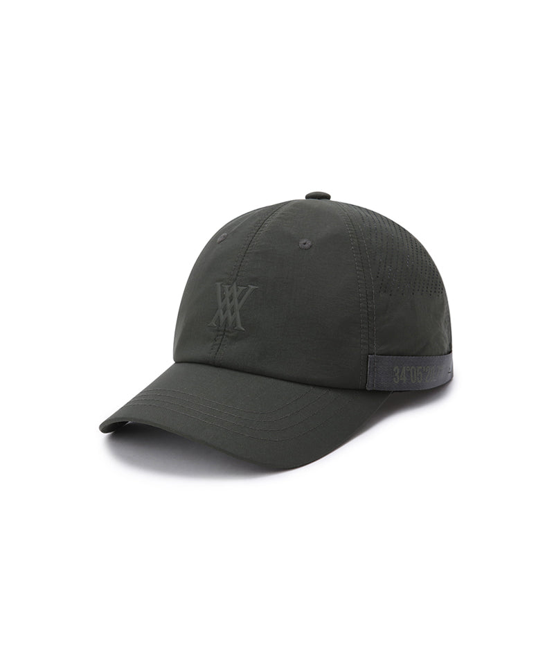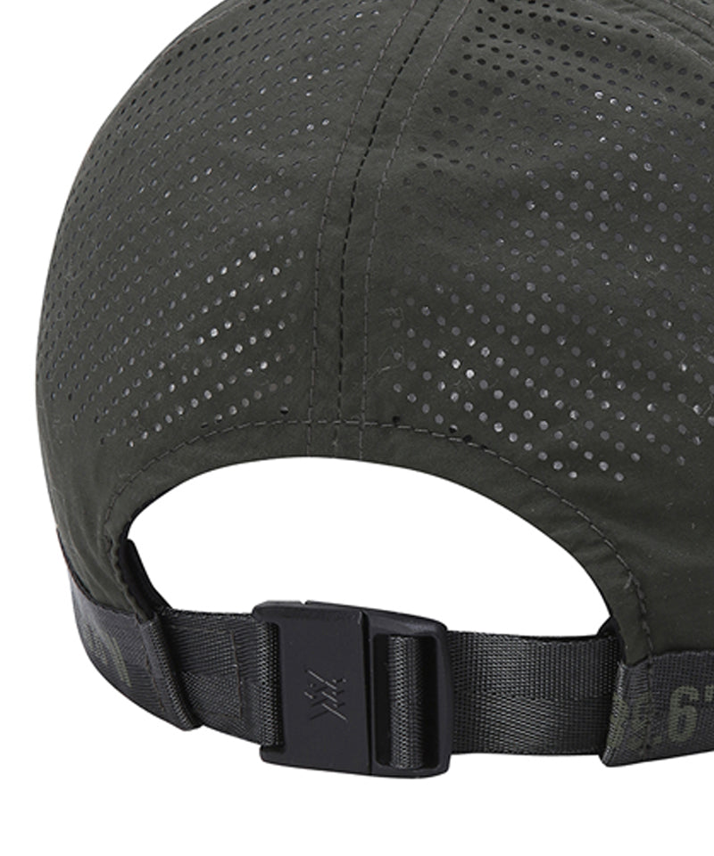 It is a ball cap with an overall soft collapse shape and a tone-on-tone louver logo on the side. The webbing strap detail is a highlight. The combination of perforations on the sides provides ventilation and a light fit.
