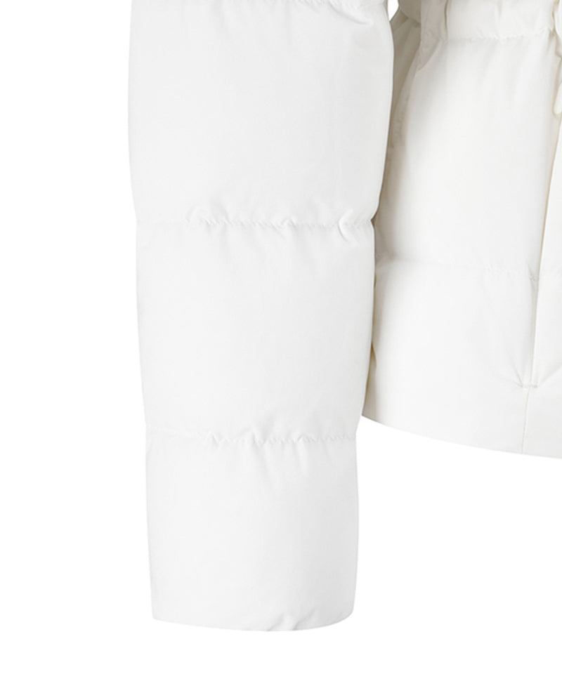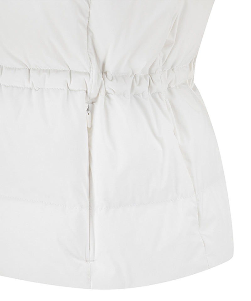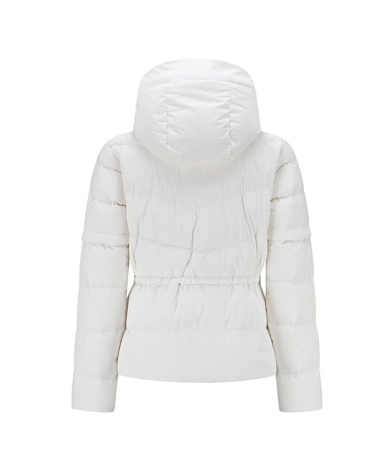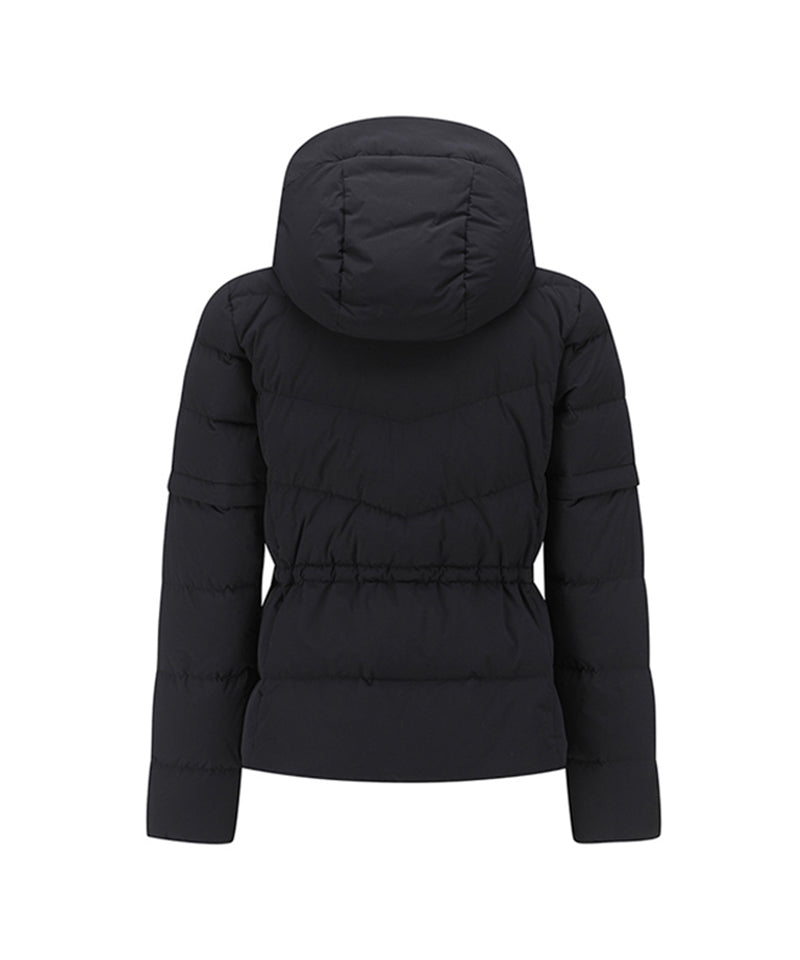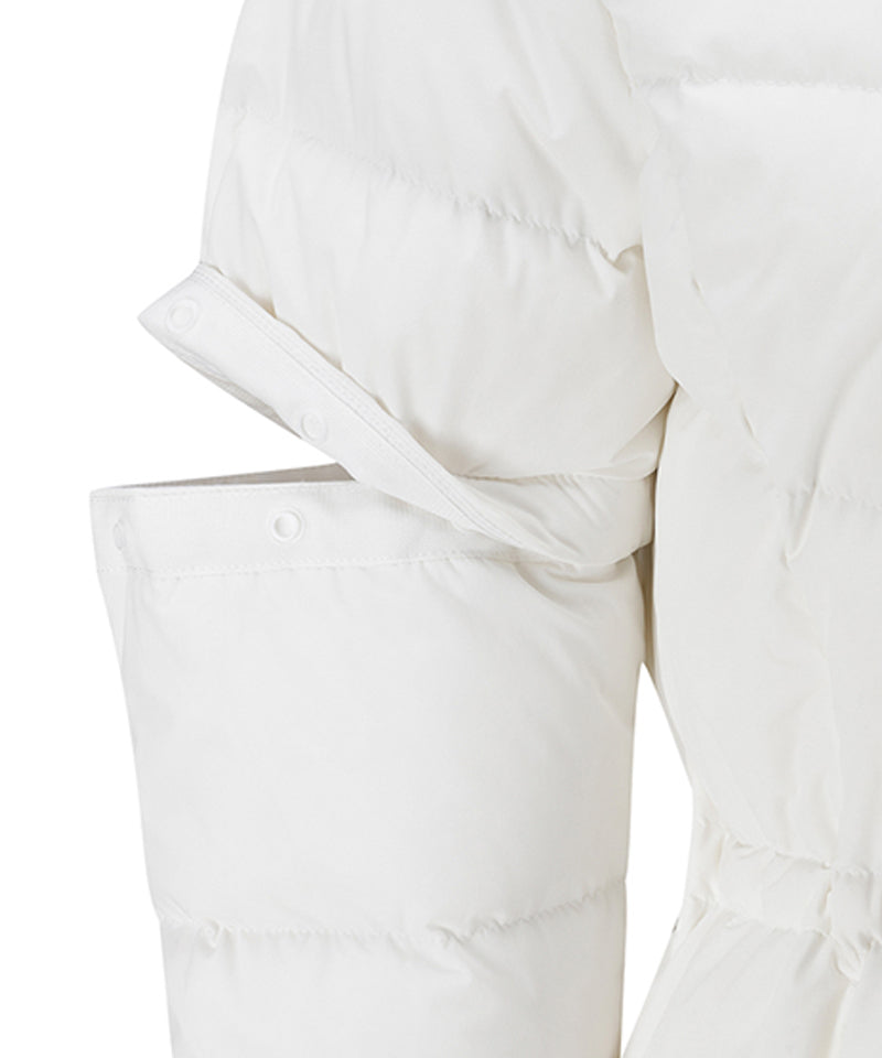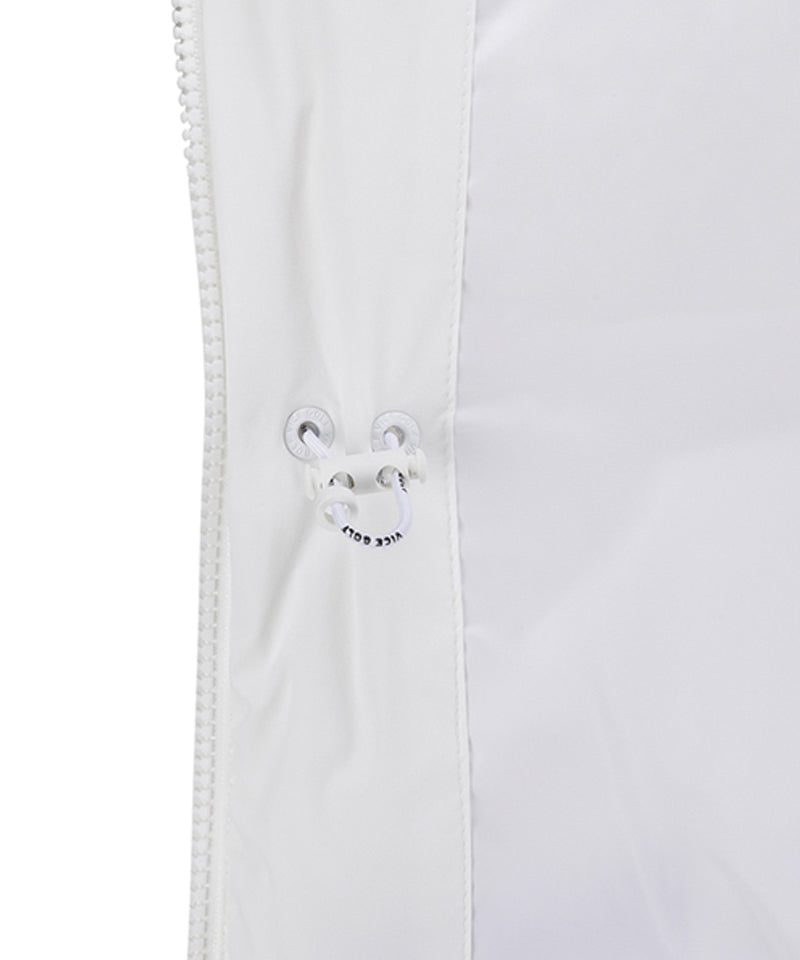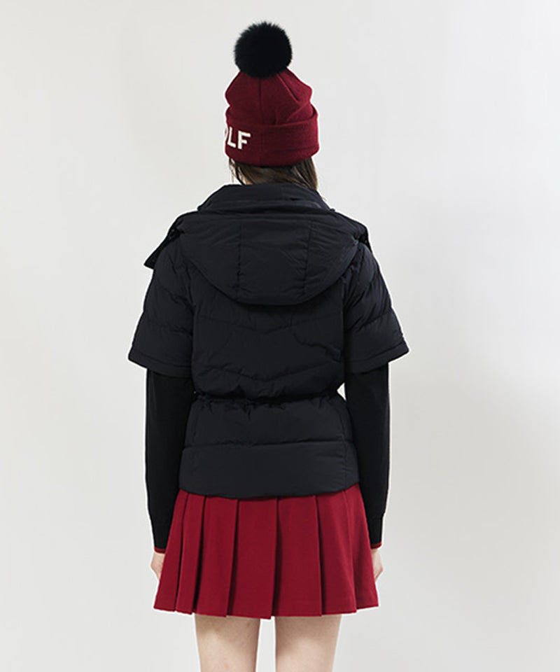 This is an anorak down jumper with detachable sleeves. The sleeves and hood are removable. It is a highly versatile item that can be worn in a variety of styles. It is lightweight using 90:10 goose down filling. The inner back panel heating lining increases warmth in winter. It has a waist size adjustment function to create a feminine line.