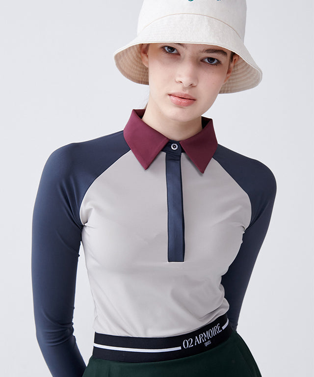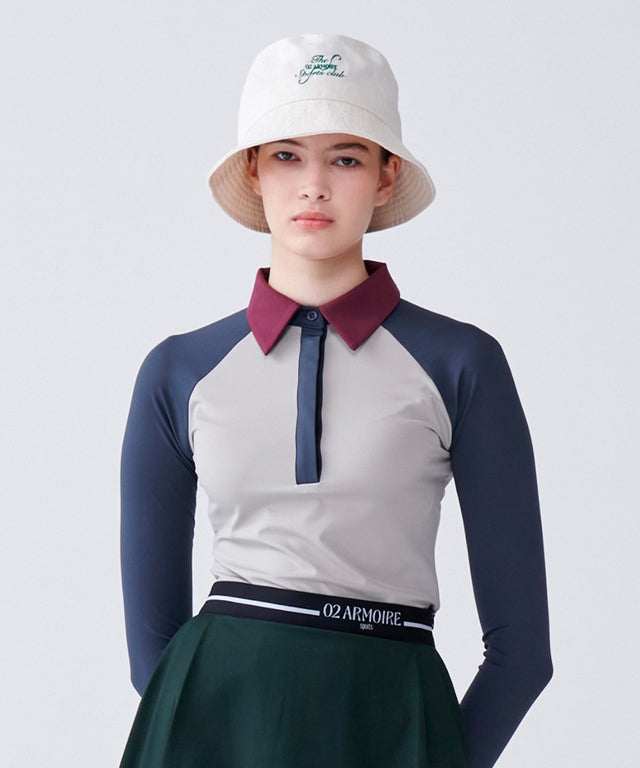 Contrasting color detail creates a unique mood. 02 ARMOIRE silicone logo detail on the left sleeve. Features UV-blocking functional fabric and soft texture fabric. Luxurious and comfortable fit with front hidden snap open closure.