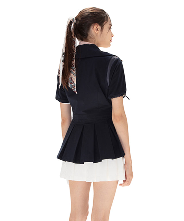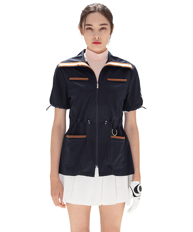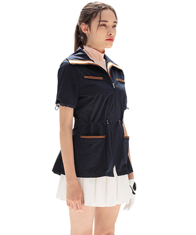 A modern, regular-fit design crafted from lightweight, soft fabric, the AVEN Stretch Even Bear Vest Jacket - Navy is a great option for layering. It boasts a sailor collar and the signature Even Bear rubber label, plus a back hem pleat detail for a fuller look that creates a flattering silhouette. Adjustable waist and sleeve strings allow you to customize the fit to your body type.