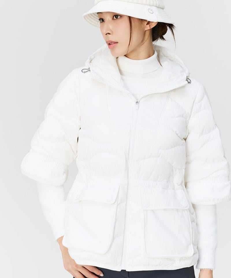 An item with a team-decorated sleeve and hood design, a loose fit silhouette, and a waist string to adjust the fit, creating a cute silhouette. Out pocket design adds cuteness and increases storage convenience. The curved hem is long enough to cover the hips, making it easy to cover your body shape. Lightweight and warm thanks to goose down filling.