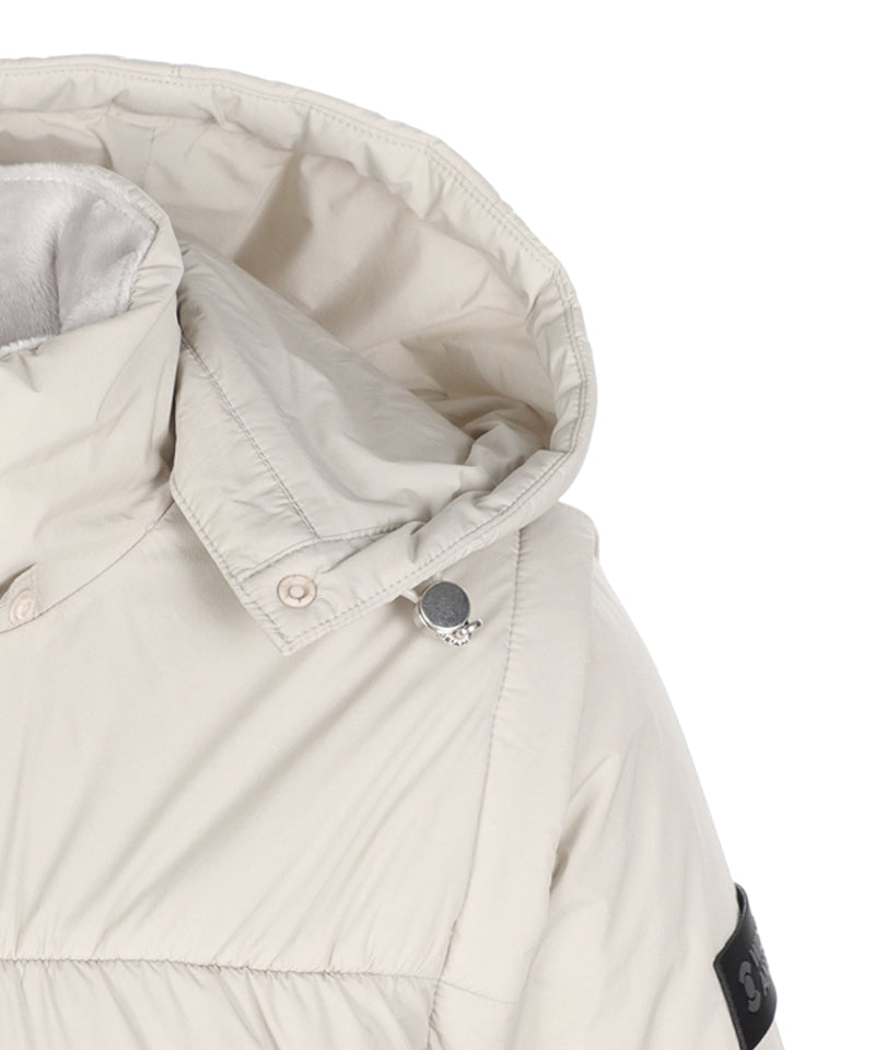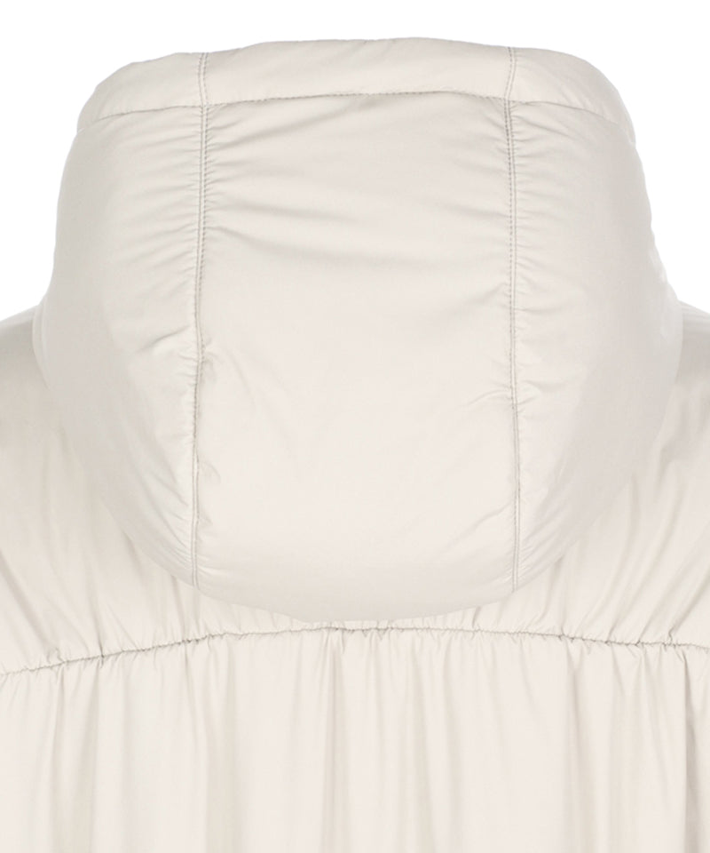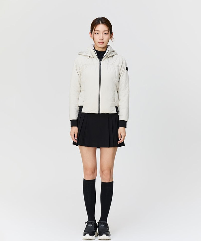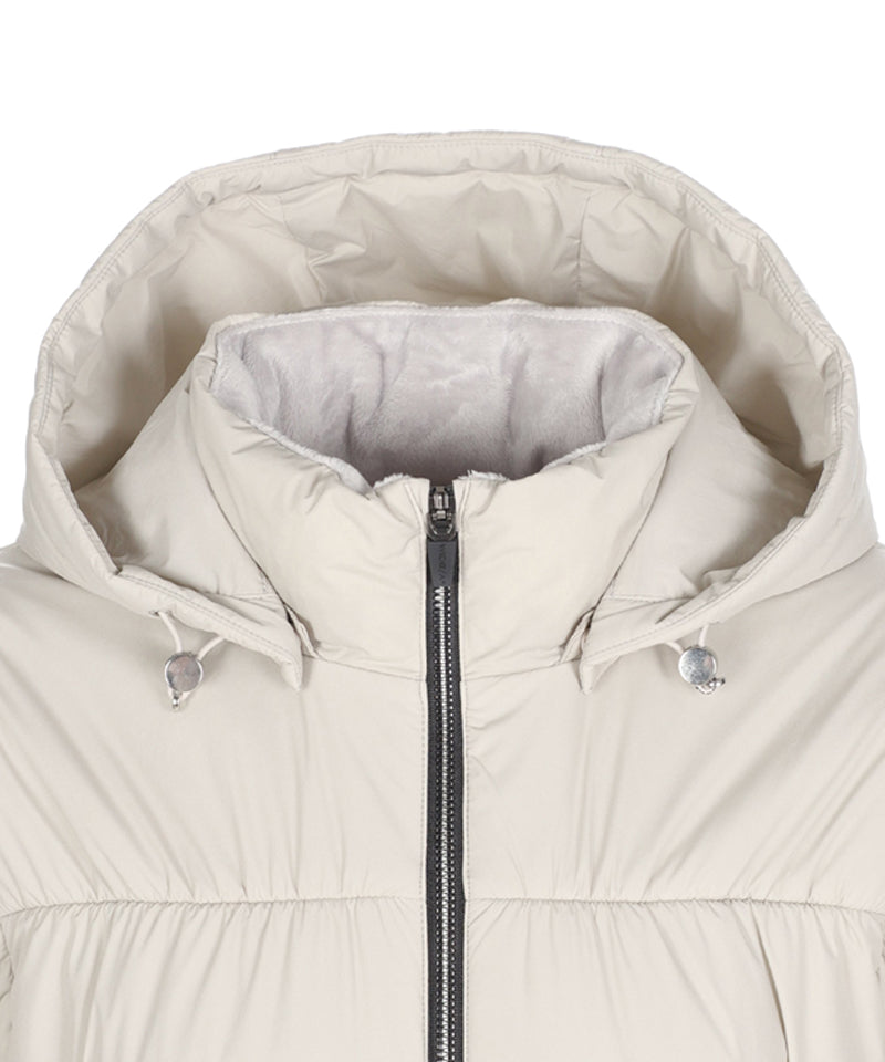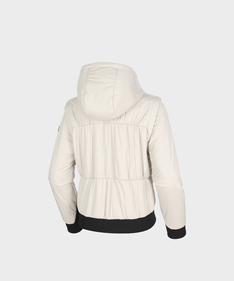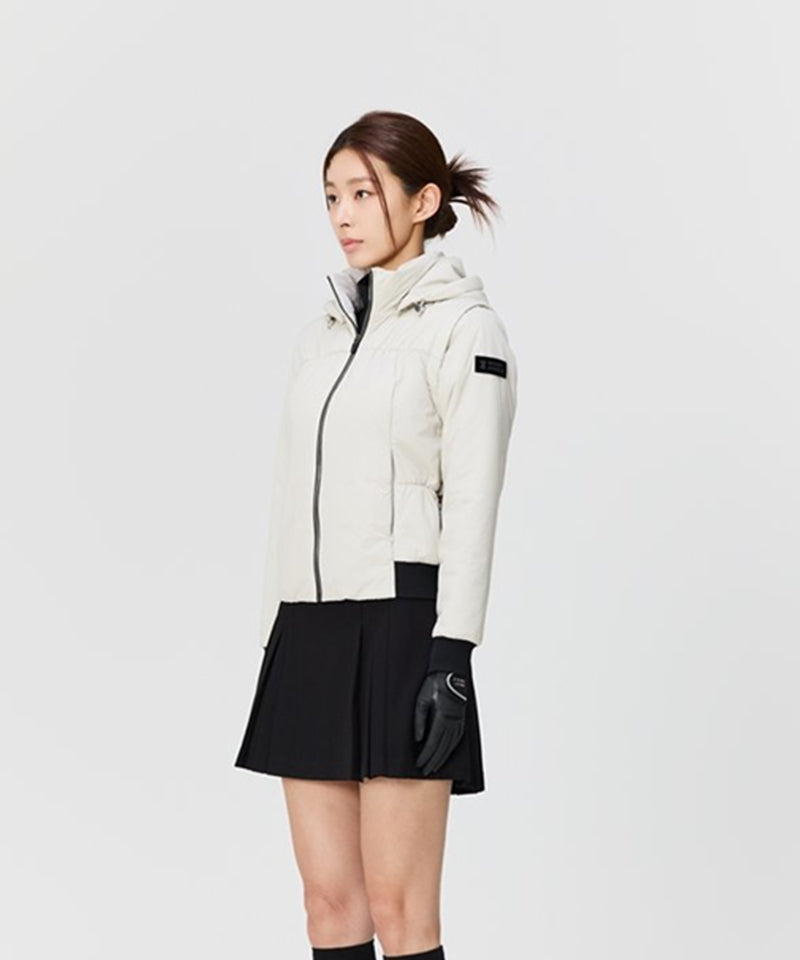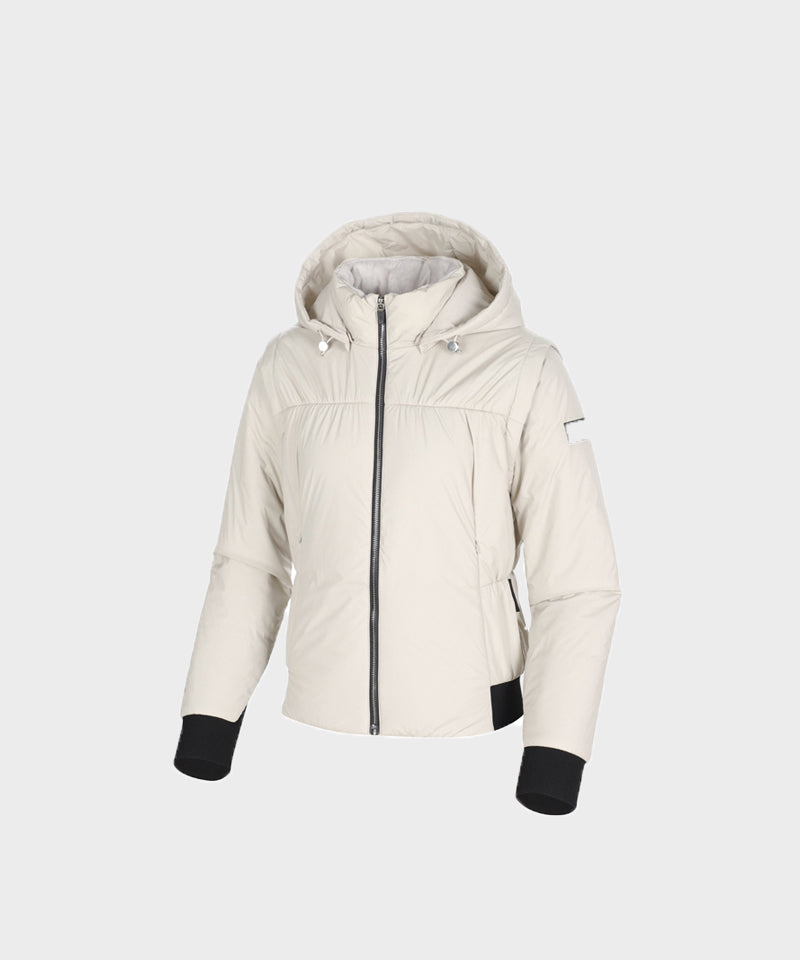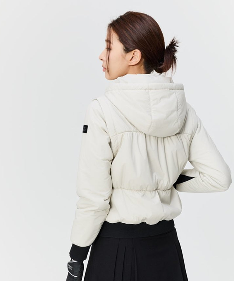 Made with soft, lightweight stretch fabric and Polartec filling for excellent thermal insulation. A feminine design that wraps around the body with shirring using an elastic band on the quilting line. Detachable hood and soft RIB fabric cuffs and hem block wind for added warmth. A highly versatile item for winter rounding due to its light fit, excellent heat retention, and mobility.
