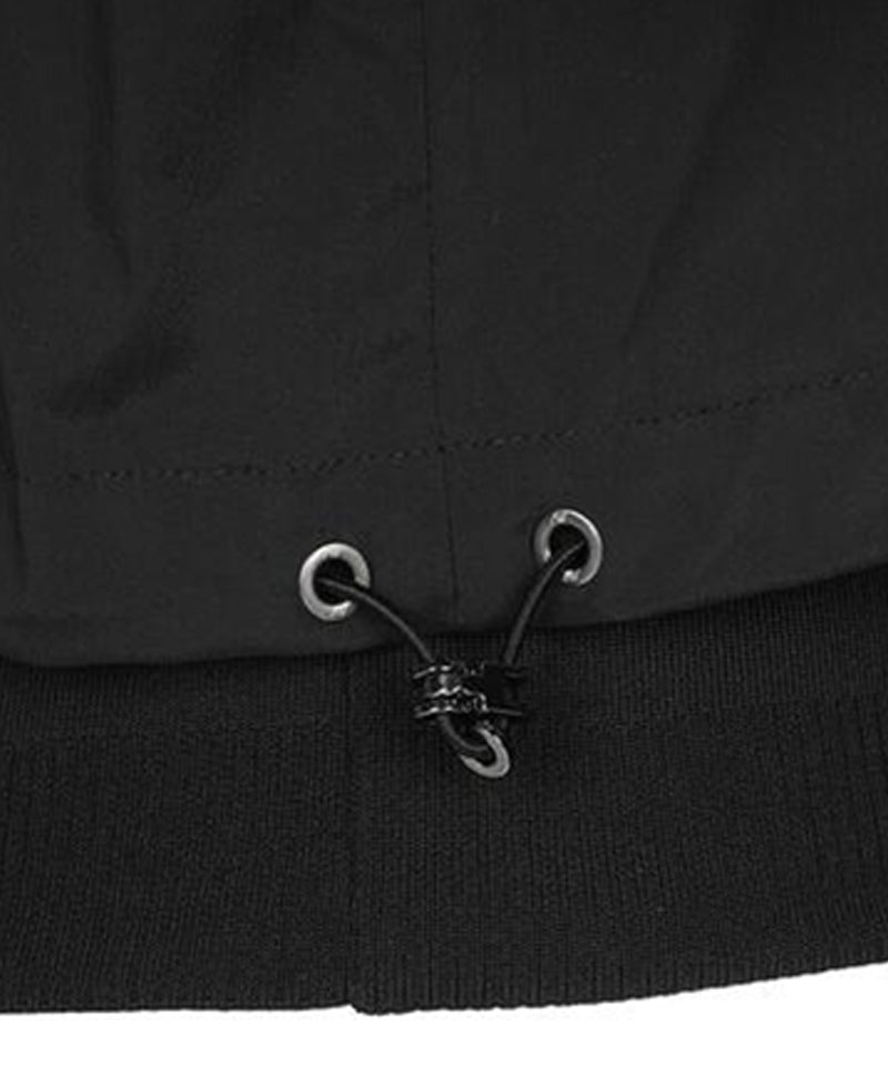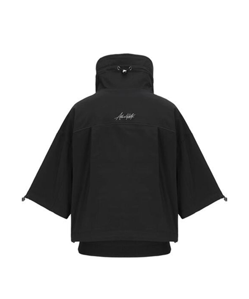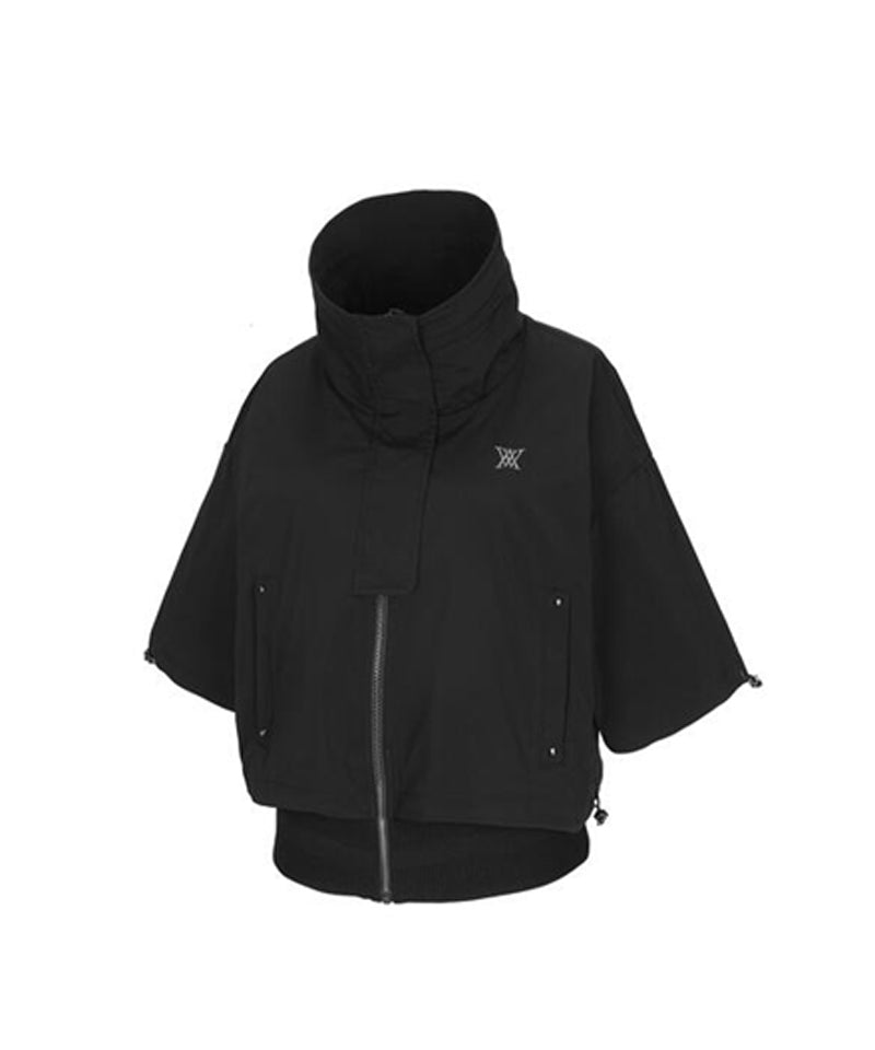 It is a short-sleeved uvenjacket. Wide neckline designs feminine details, cuffs, and strings at the waist, The Waist hem part wide lip to create a slim line. There is a placket detail that has the effect of not looking long on the upper body.