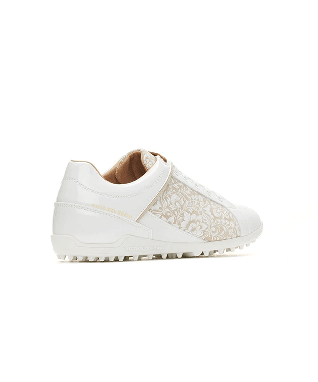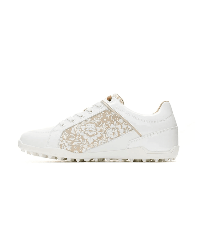 The Caldes women's golf shoe combines a feminine floral design with eye-catching technical features. Soft Italian Nappa leather, floral pattern suede, patent leather.