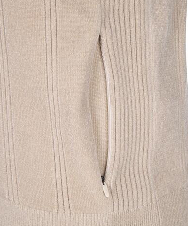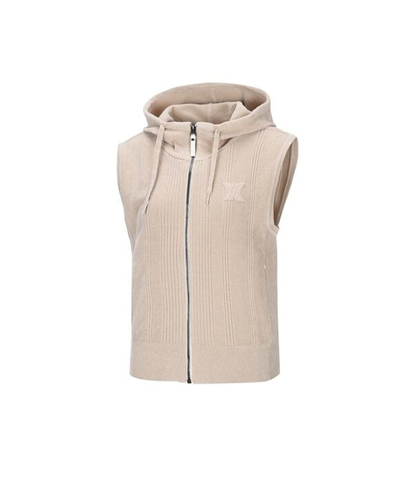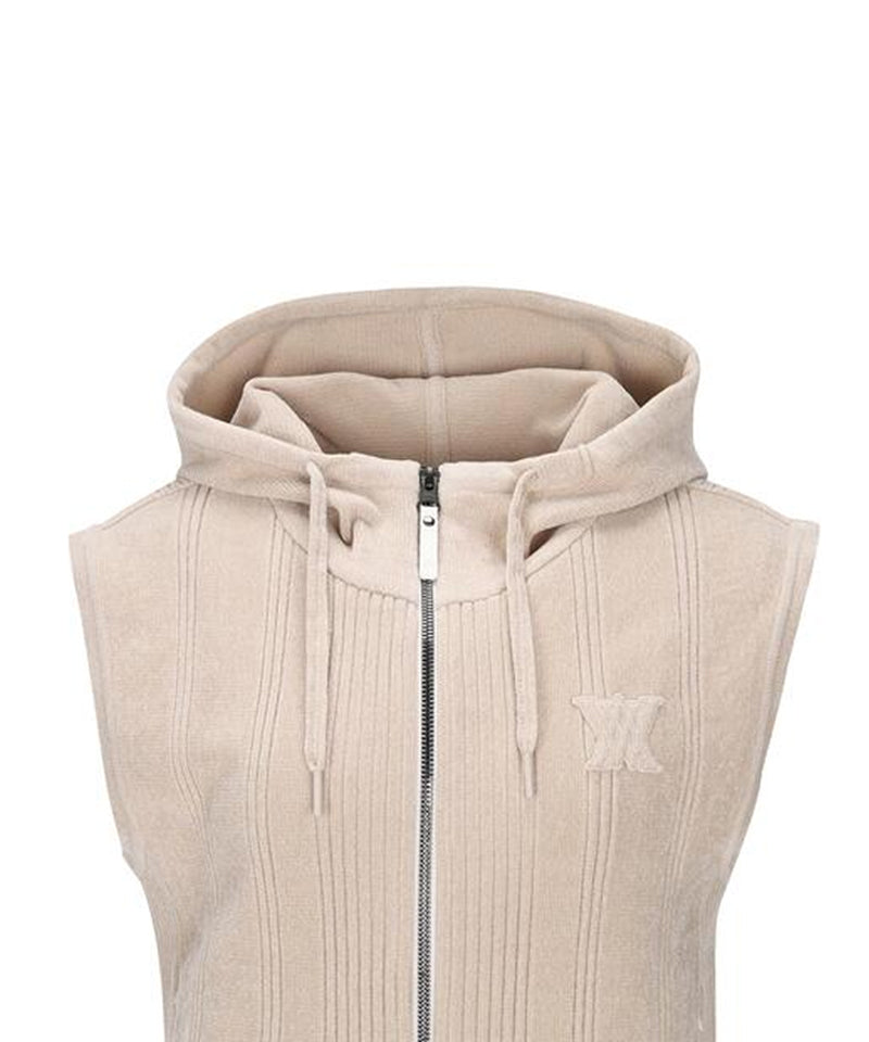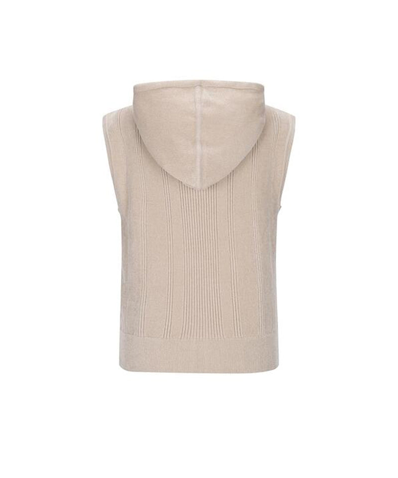 This women's chenille knit hooded zip-up vest is designed to be worn warmly over an inner layer during the fall. It features a hood, making it suitable for casual wear with any outfit. The vest is crafted from a knit fabric with a distinctive rib structure that extends throughout the body, adding both texture and style.