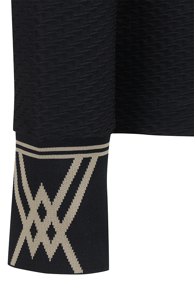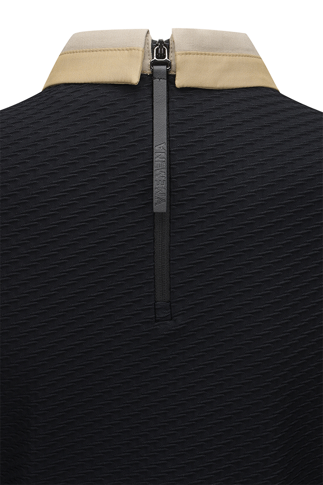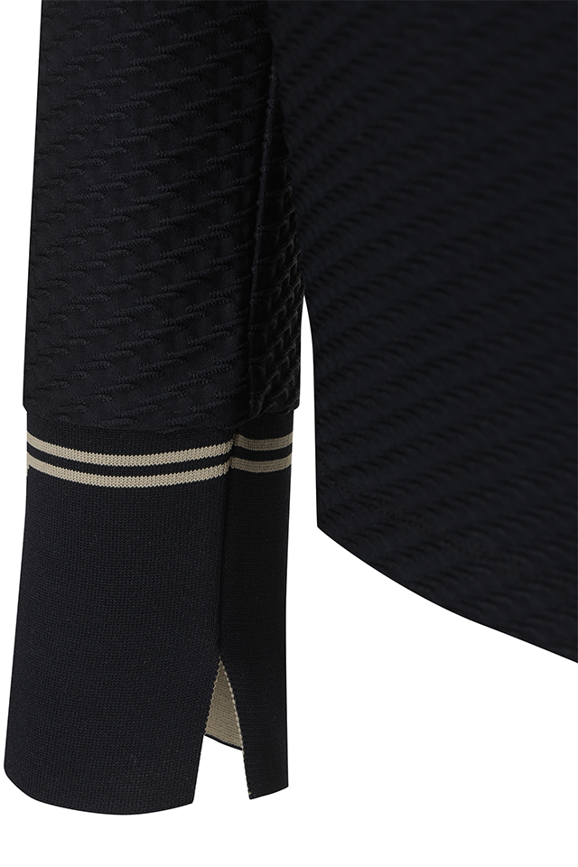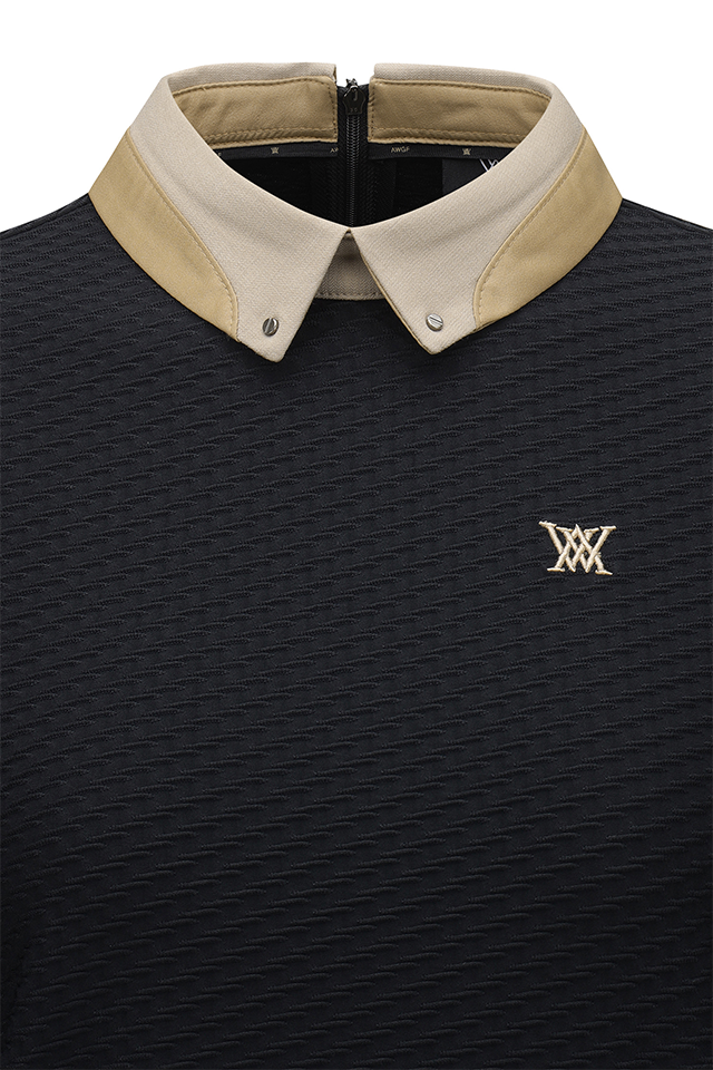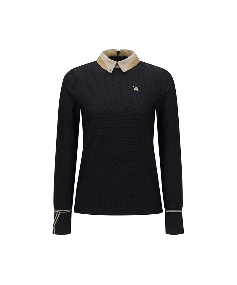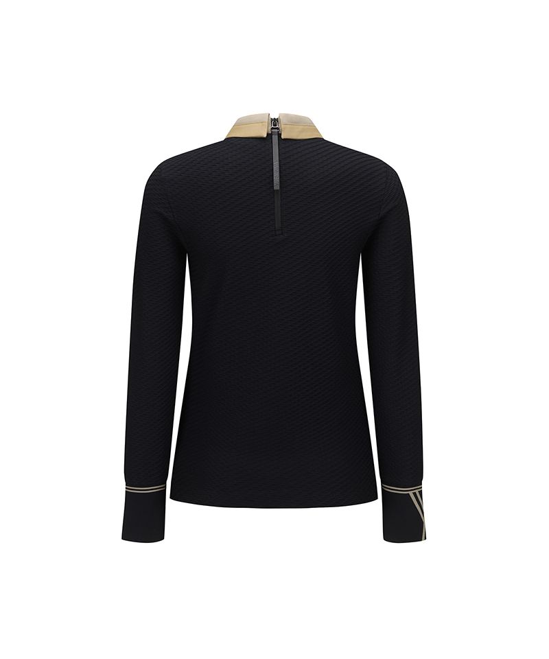 This fall T-shirt features a slim silhouette achieved through stretch fabric. With contrasting collar and sleeve colors, it stands out even when worn alone and pairs well with V-neck knits. The sleeve ends are finished with contrast tipping and embroidered logos for a refined look, while trim details create the effect of longer-looking arms.