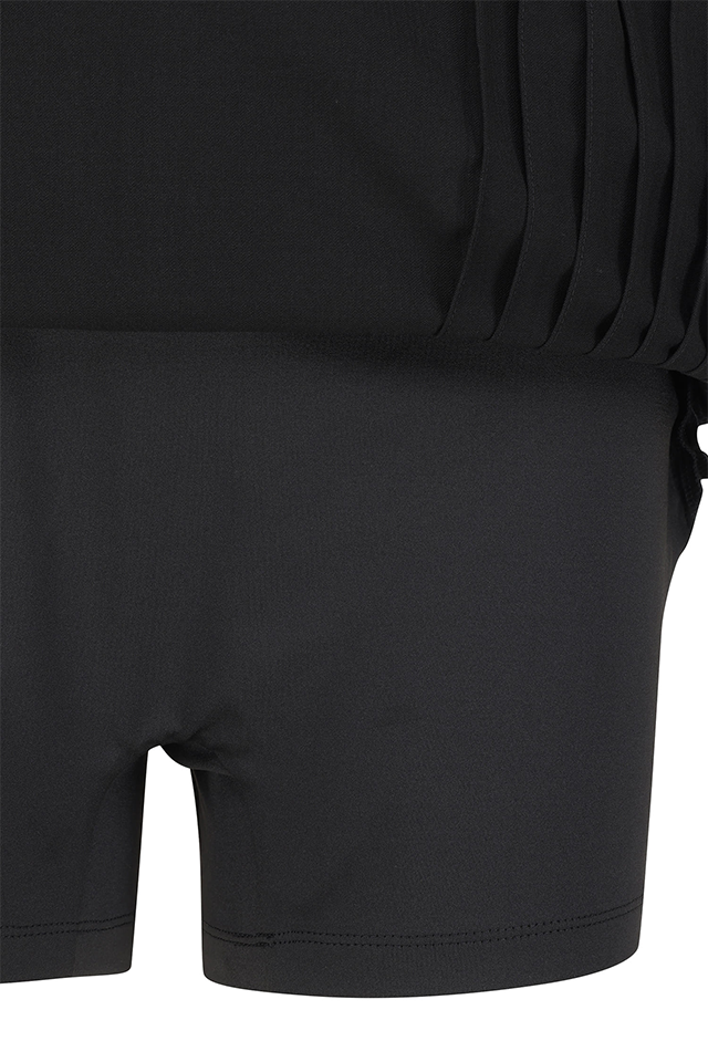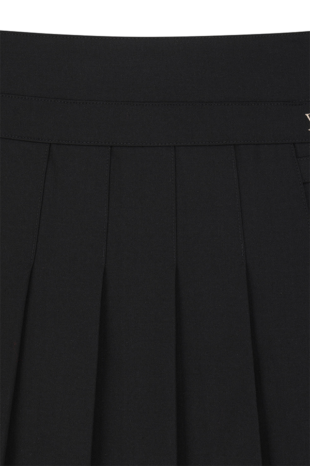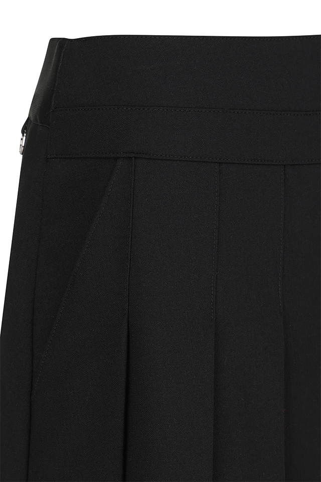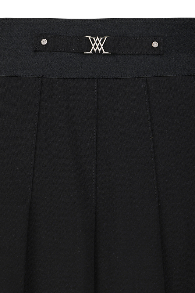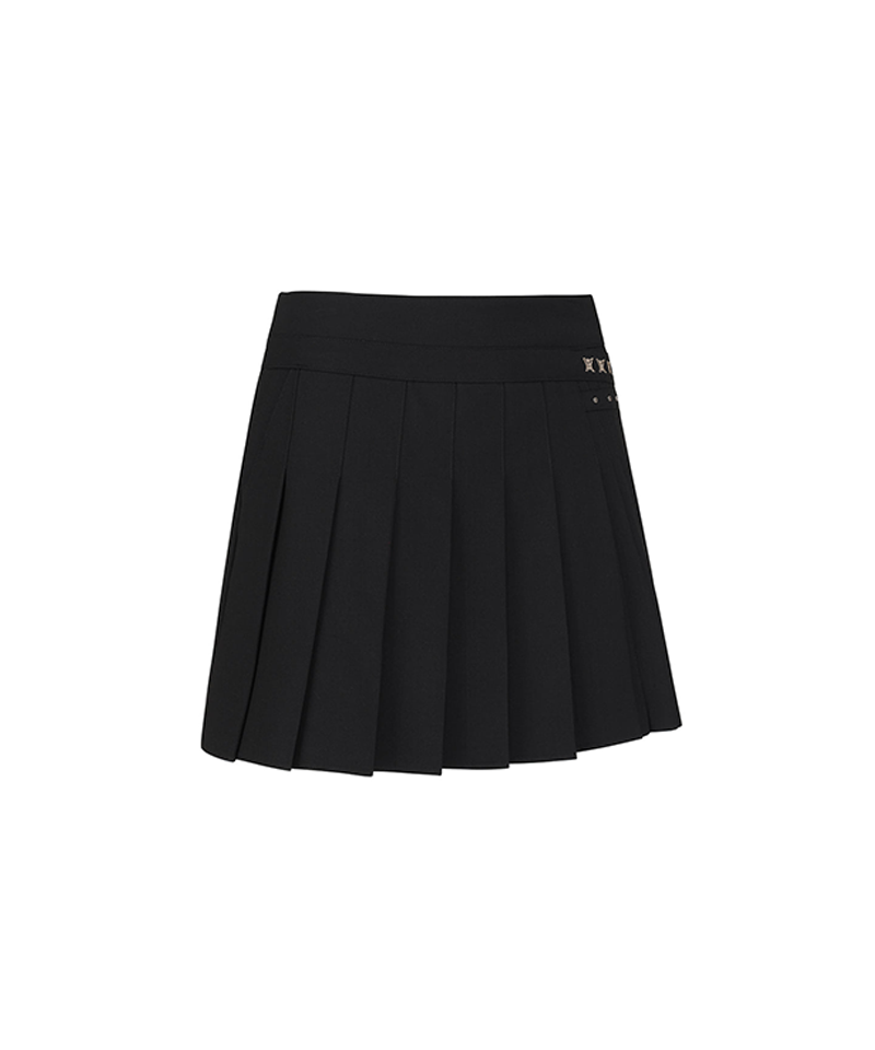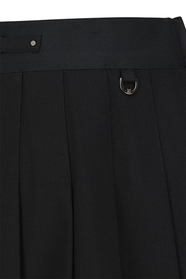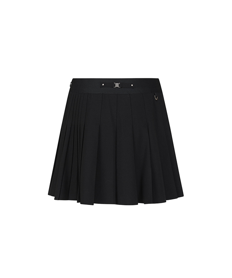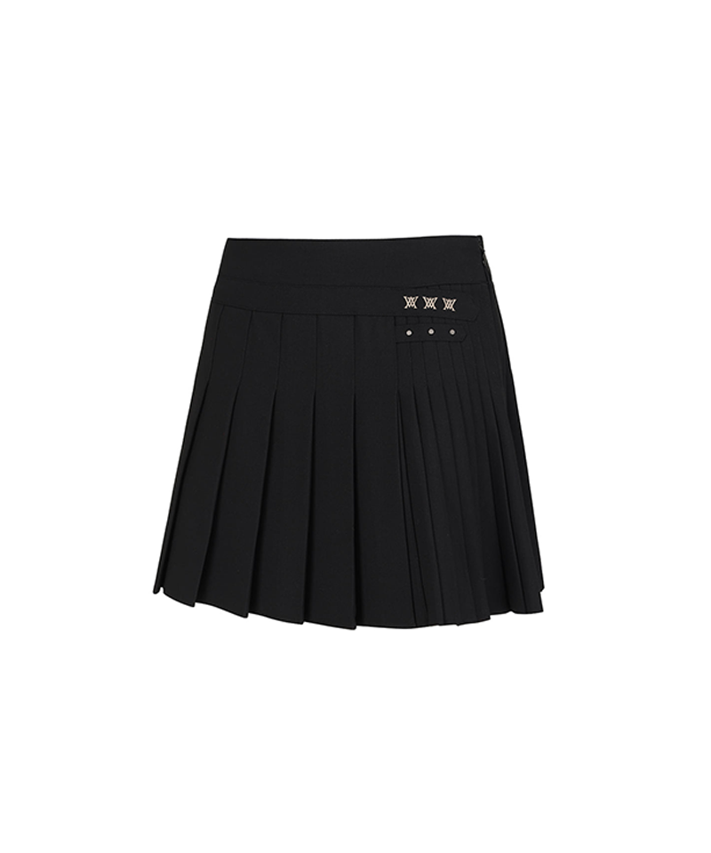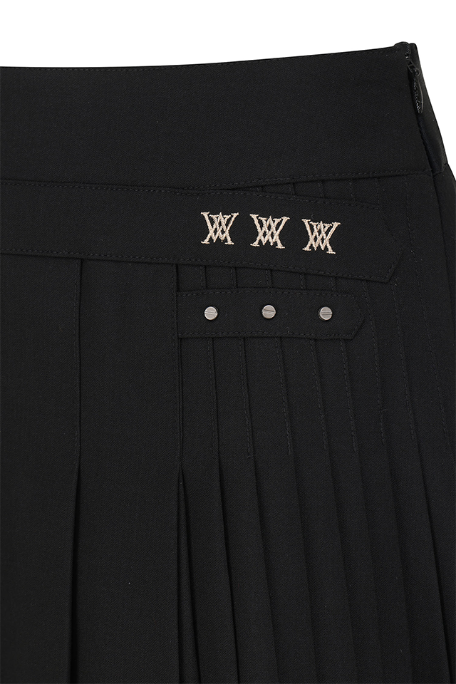 This pleated skirt features a unique design with a twisted wrap shape. The waistband features a logo embroidery and metal accents for a striking look. The back features elastic banding for a secure fit and enhanced comfort. A pocket on the right side adds practicality.