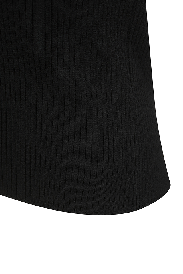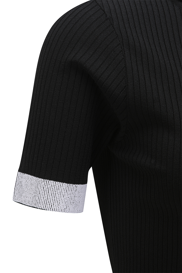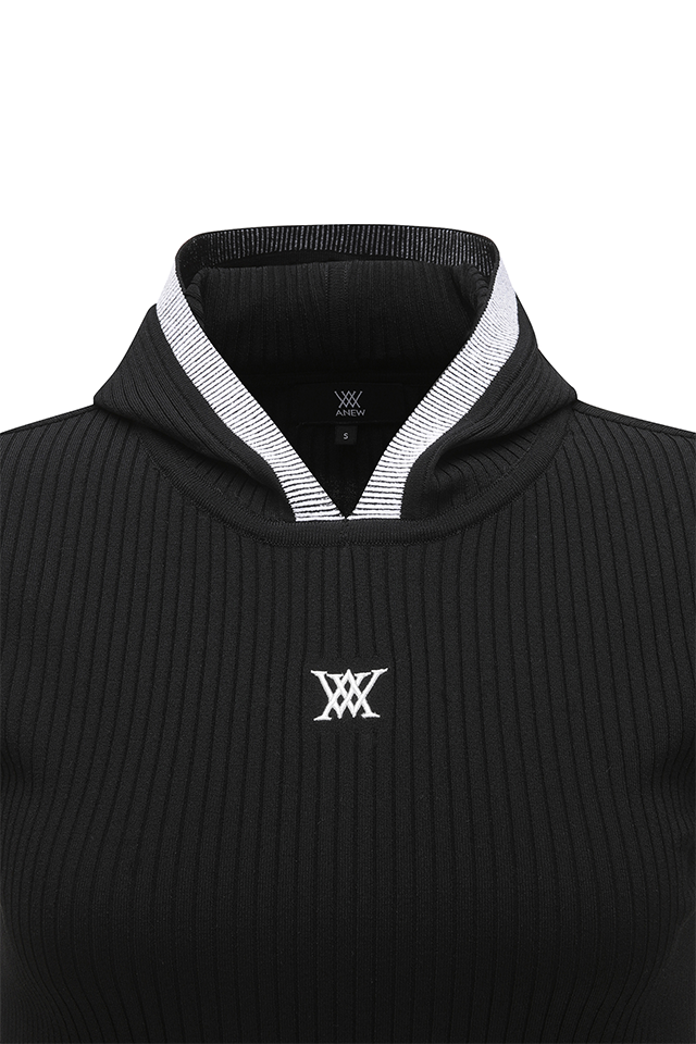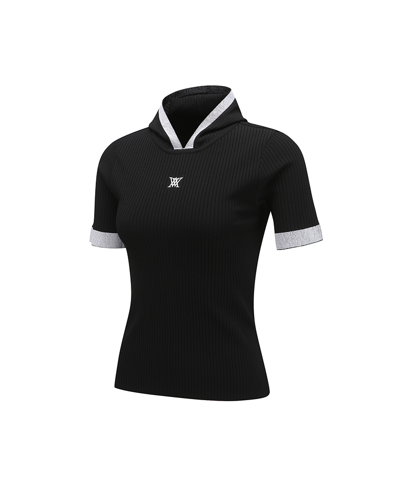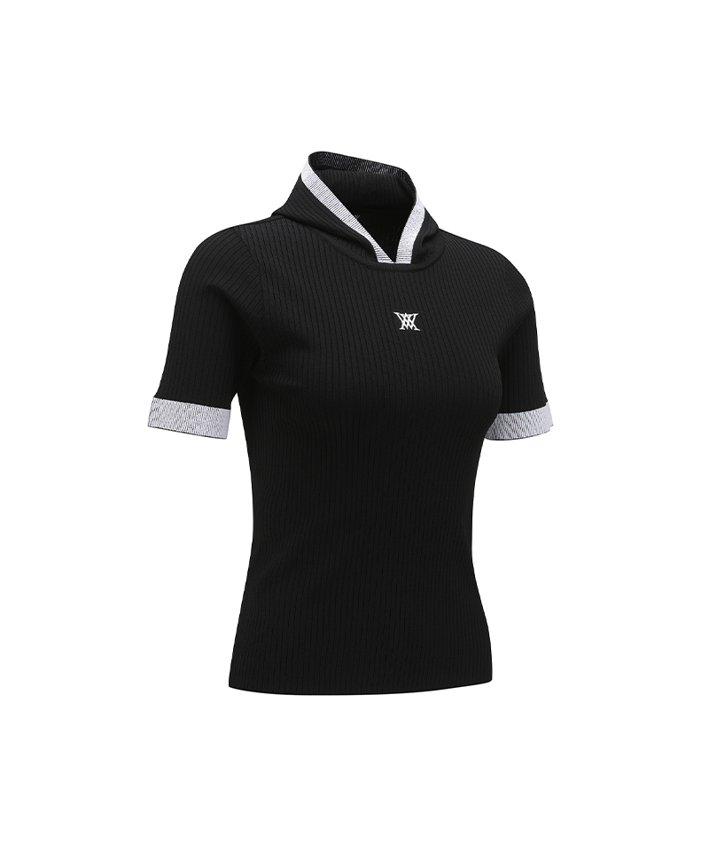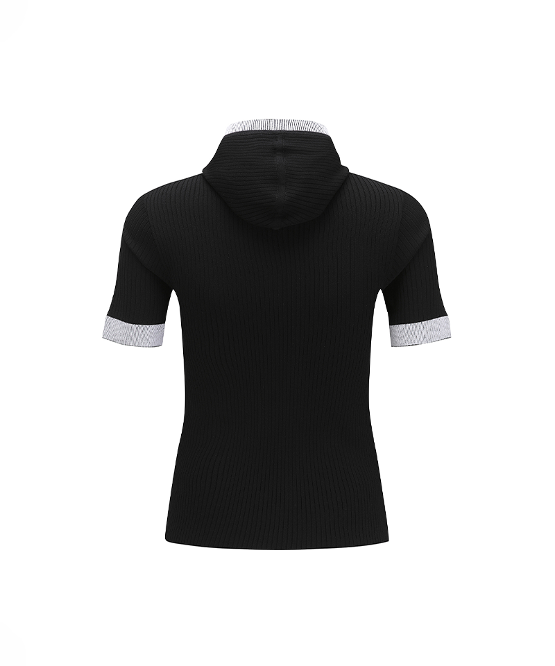 This mini hood half-sleeve knit features a form-fitting silhouette with an overall ribbed texture. A round embroidery in a contrasting color on the chest adds a stylish focal point, while the cuffs and hood are accented with a double contrasting color design. Versatile and easy to style, it pairs effortlessly with white or black bottoms for a chic, coordinated look.